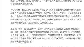深蓝汽车回应S09长得像理想L9 12月10日,@深蓝汽车 发文回应长得像理想L9。原文如下:深蓝S09曝光后,得到了全网的关注,其中有不少人在讨论长得像理想L9?关于这个小编想和大家说道说道。 深蓝S09是一款为全家人而来的大六座SUV。我们设计这款产品的初衷是因为我们的用户在伴随着深蓝品牌成长的同时,他们的人生阶段也在进阶,从单身到结婚生子,父母同住,现有的车辆已经不能很好地满足他们的家庭出行需求,他们需要一辆能够满载一家人的车。与此同时,他们仍有着年轻的心态,追求科技潮流,在实现自我梦想的路上,努力满足家人的期待和向往。 基于此,我们开发了深蓝S09。这款产品的外观设计上是经过设计师们精心雕琢的,拥有一套获得红点奖产品设计奖的家族化设计语言。同时深蓝 S09无论是从外观造型、配置、动力、智驾和价值方面,的确是和理想L9、问界M9是同一级别的,我们欢迎大家拿我们深蓝S09去和其他两款产品进行比较,毕竟这几款车型都是值得大家购买的好产品! 12月10日,理想高管@硬哥 在微博上贴出了深蓝S09和理想L9的车身侧面照,并配文“理想智行系列又壮大了?”疑似内涵深蓝S09像理想L9。