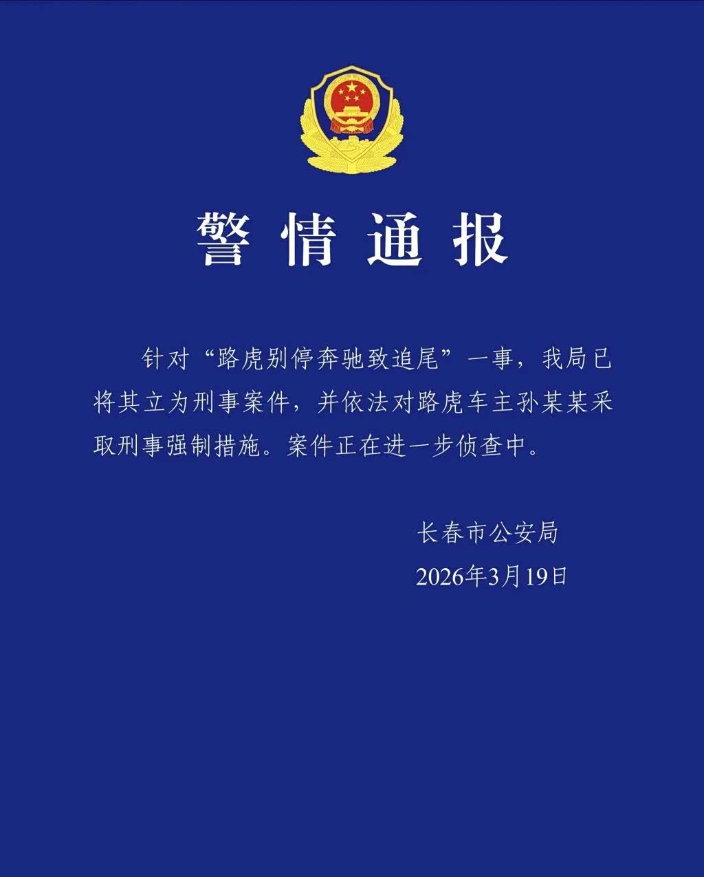 3月19日,吉林长春市公安局发布警情通报:针对“路虎别停奔驰致追尾”一事,我局已将其立为刑事案件,并依法对路虎车主孙某某采取刑事强制措施。(新华社)