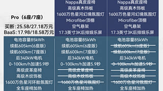 乐道L90 今晚这价格,你们觉得能爆吗? 具体配置来看,无论是 6 座版还是 7 座版,都是 3 个配置。 入门的Pro 版基本都标配了,包括冰箱、一二排座椅通/加/按、三排座椅加热、电吸门、CDC可变阻尼减震、AR-HUD抬头显示等等。 Max 版换来更好的内饰材质以及更好的氛围灯,同时新增了空悬以及后排屏。 Ultra 版则主要是新增了一个前电机,也就是四驱版,带来更好的动力性能,同时零重力座椅也在 Ultra 版上配备。 另外需要注意的是,电动踏板全系都得选装,选装价格是1万元;Max 版可选装零重力座椅,价格为 1.2 万元。 这个价格的话,你们冲哪个版本?