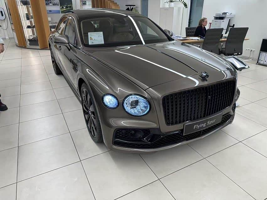配置:24款 穆勒版 飞驰 V8  颜色:黑外 内饰:双拼棕咖双拼内饰 配置:         四座 双拼方向盘, 纳米音响,天窗,舒适包座椅通风加热按摩,翻转屏,氛围灯,菱形格座椅,电吸门,旅行包ACC雷测夜视系统抬头显示,22寸穆莱尔轮毂,前中网全镀铬, 发光升降标,无钥匙进入,后排电动遮阳帘,led迎宾灯 生产日期:24.10