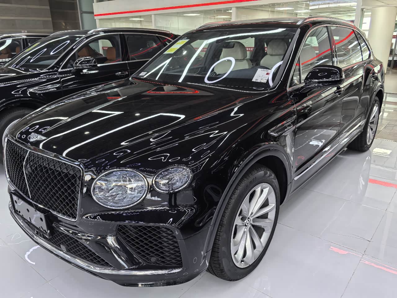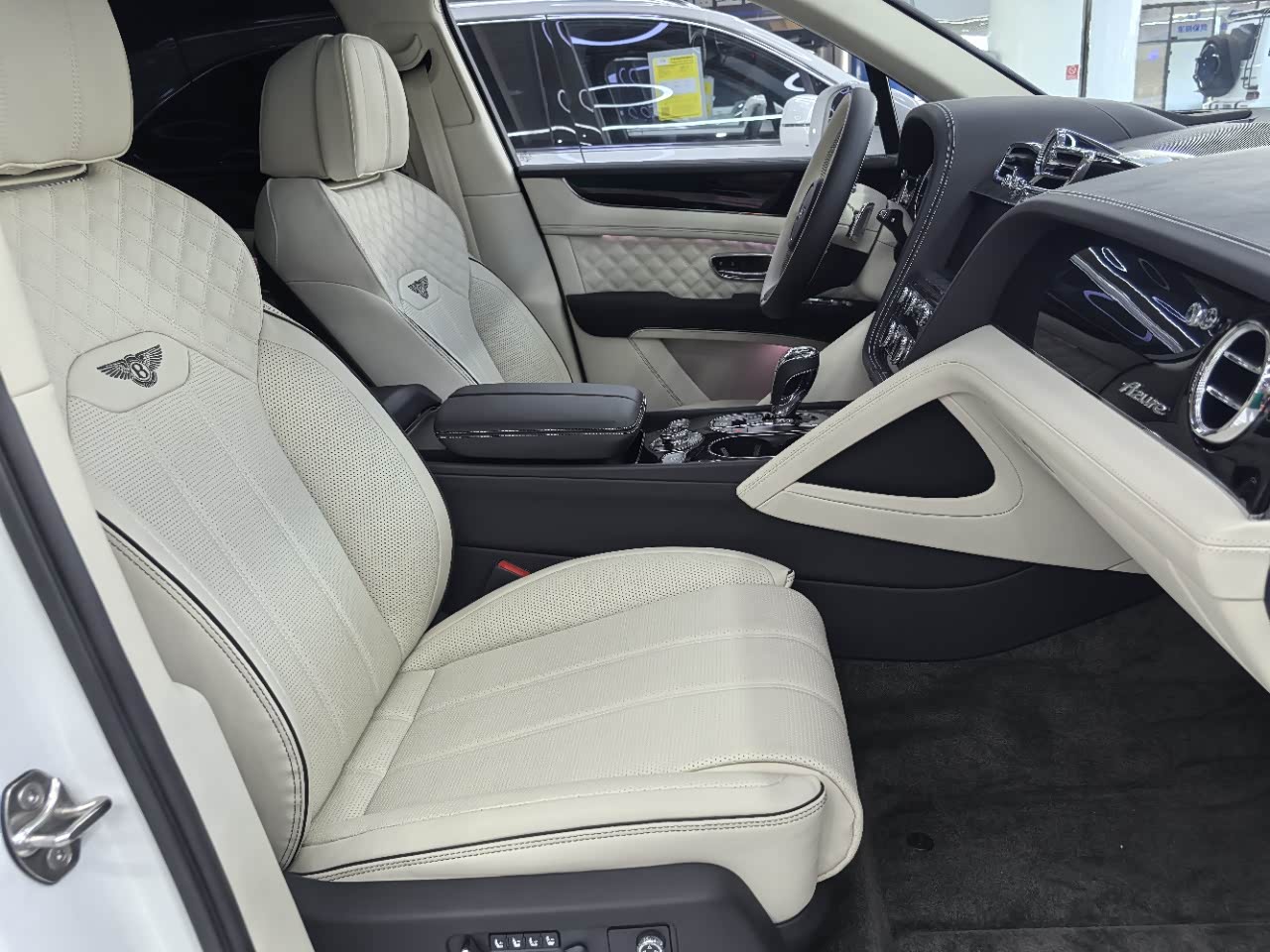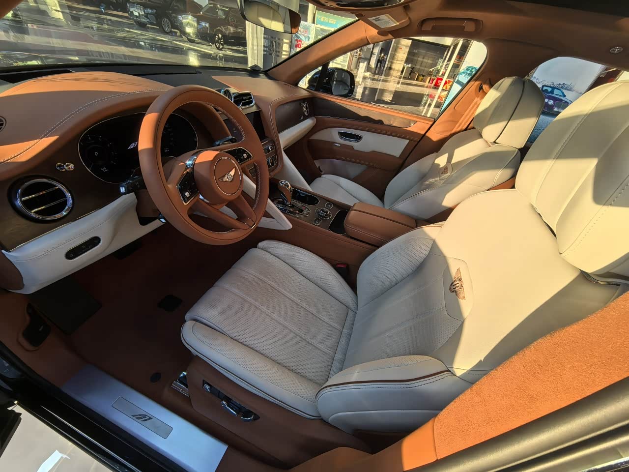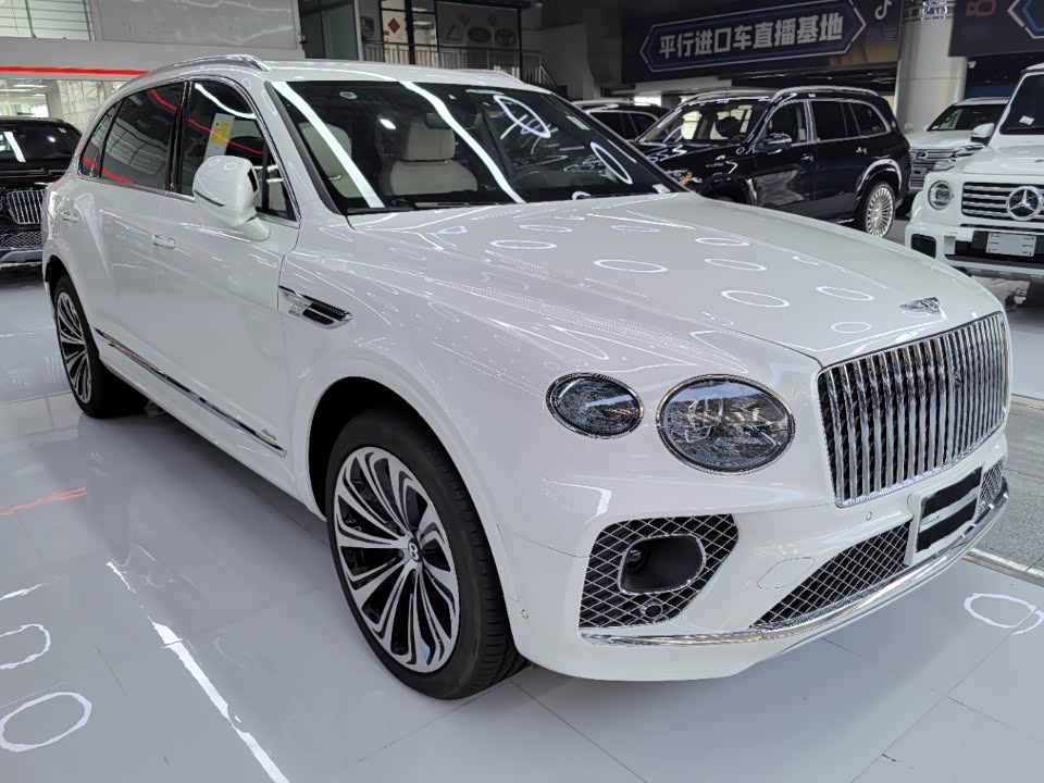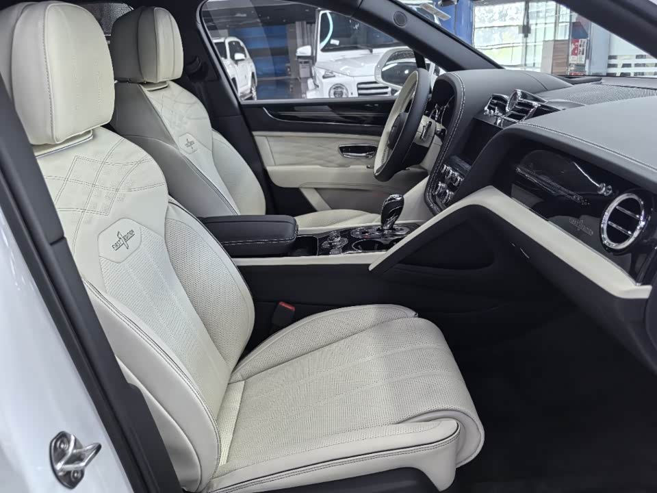 24款宾利.添越 V8标轴 A 版 260增值 外观:宝石黑 内饰:亚麻白/纽马克特褐 选配:22 寸五幅定向铝合金喷漆轮毂 自正式轮毂盖 天然哑光直纹胡桃木饰面板 双色多功能加热方向盘  座椅宾利徽章刺绣  反衬色座椅滚边 反衬色座椅缝线 前排座椅(通风 加热 按摩 )后排折叠桌板  旅行包(雷达测距 夜视 抬头显示) 日期24.12 开票233左右