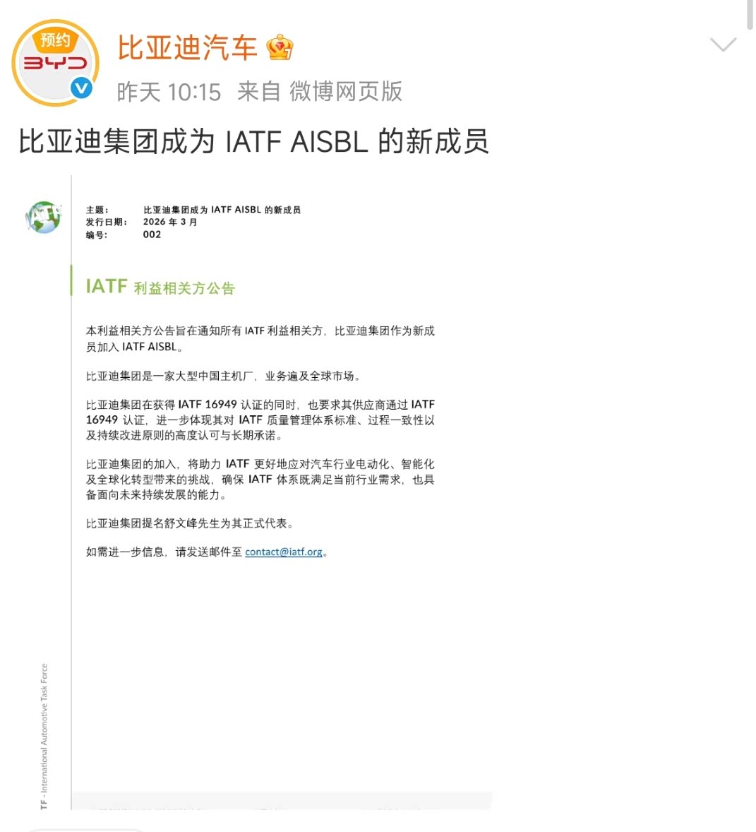 比亚迪正式加入国际汽车工作组IATF,很多人其实不怎么清楚这个组织是干嘛的,有什么意义? 首先IATF是全球汽车质量管理体系的权威组织,以前都是欧美那些汽车工业强国点车企为主,现在意义就很重大了,世界范围的认可,从制造到智造、创造!#比亚迪[超话]#