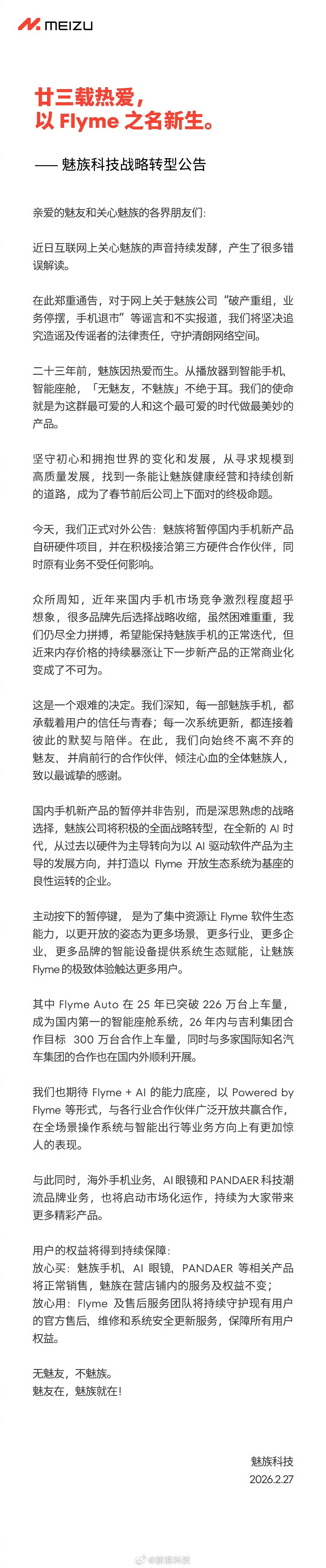 无魅友,不魅族! 前段时间网传人家破产重组等等的消息,荒谬 就大家想想,魅族的转型可以说很成功,往AI往科技智能方向转型,这是一个大方向,又或者海外手机竞争没那么激烈的地方拓展。#魅族[超话]##魅族发布声明#