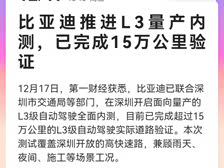 比亚迪全面推进L3级自动驾驶量产内测 已完成15万公里验证