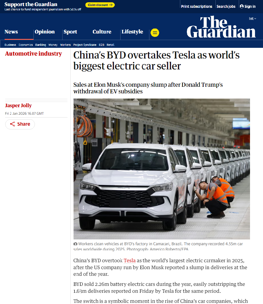 比亚迪在2025年以全年超过225万辆的纯电动汽车销量,首次超越特斯拉,登顶全球榜首。这一历史性超越,不仅意味着销量的领先,更标志着全球新能源汽车竞争格局迎来重塑,是中国汽车工业实现从追赶到引领的关键转折。 我认为,其成功根植于难以复制的体系化优势。一方面,比亚迪凭借垂直整合的全产业链与快速技术迭代,构筑了核心护城河;另一方面,出海与本地化并重的纵深战略,使其在欧洲、亚太、南美等市场扎实扎根,实现了从产品输出到产业生态构建的飞跃。 因此,比亚迪的登顶具有深刻的行业启示。它证明了以持续创新为内核、以全球本地化为支撑的发展路径是可持续的。比亚迪已从挑战者蜕变为规则的塑造者,其历程无疑为全球产业树立了新能源汽车行业新标杆。
