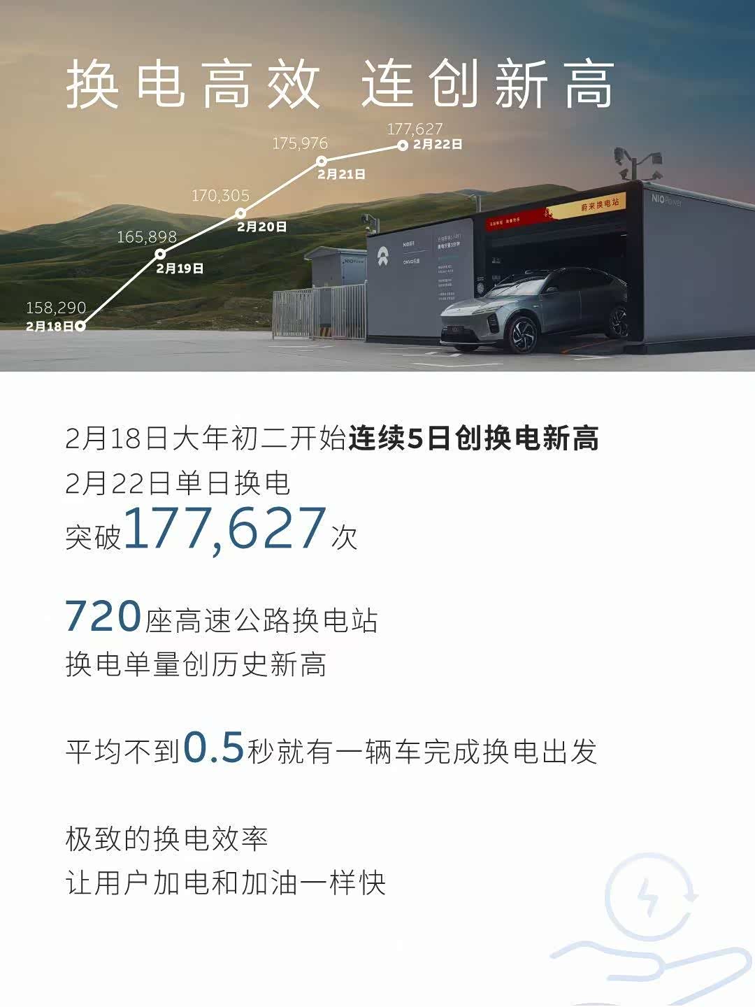 讲真的,今年春运刷到太多新能源车主在高速充电桩前冻得搓手排队的视频,转头看到蔚来这份春节加电报告,只能说:没有对比就没有伤害。 从大年初二返程潮起,蔚来换电直接连破5天单日服务纪录,2月22日冲到177627次,平均不到0.5秒就有一台车满电出发。 别跟我扯什么800V超充5分钟补能200公里,春运高峰里,你排队2小时能插上枪就赢了。功率分流、低温打折、下车挨冻,这些超充绕不开的变量,换电全给你解决了。 春节期间蔚来累计完成207万次换电,高速加电量里80%来自换电,1022座高速换电站给用户省了超49万小时排队时间,18万车主全程靠换电跑完长途,这就是最实在的用户投票。 更别说换电县县通覆盖1200个区县,春节县城单量暴涨279%;2.8万根充电桩全品牌开放,85%电量服务其他品牌车主;2.5万次电池灵活升级,低成本解锁长续航。 从1亿次换电达成到春运封神,早有人唱衰换电重资产走不通,结果市场和用户早就给了答案。2026年还要新增1000座换电站,只能说,蔚来这步棋,走得够狠,也够远。