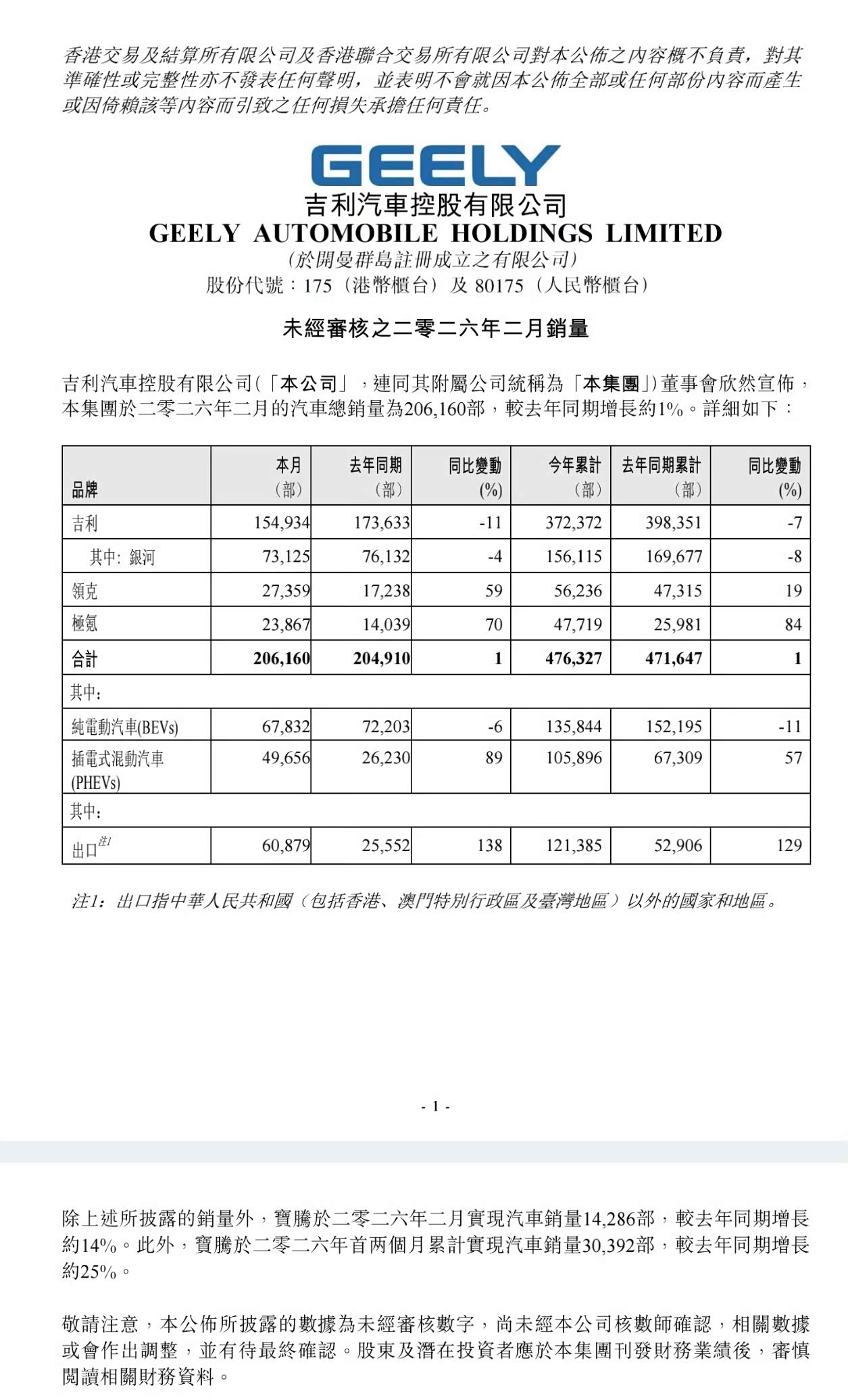 2026年2月,吉利汽车以206160辆月度销量、476327辆1-2月累计销量,蝉联中国自主品牌乘用车销量冠军,继1月打破比亚迪长达40个月的销冠纪录后再次登顶,标志着中国车市正式进入吉利与比亚迪双雄并行的G2时代。 我们可以看到: 第一,2月吉利总销量206160辆,比亚迪新能源总销量190190辆;1-2月吉利累计销量476327辆,比亚迪累计新能源销量400241辆。 第二,行业政策切换周期下,吉利实现连续两月同比正增长,比亚迪新能源销量出现阶段性同比下滑,油电并举的全品类布局展现出更强的抗周期能力。 第三,吉利高端品牌(领克、极氪)同比增速均超50%,成为利润与品牌溢价的核心支撑;比亚迪仍以10-20万主流市场为销量基本盘,高端品牌规模化贡献仍待释放。 第四,全球化布局:比亚迪出口规模领先,以整车出海快速铺量;吉利出口增速更高,以本土化体系深耕全球市场,实现从产品出海到体系出海的升级。 比亚迪all in新能源的战略,曾推动中国汽车产业完成新能源普及革命,创下连续40个月自主销冠的行业纪录,其在三电技术、供应链垂直整合上的核心优势依然突出。