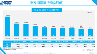 乘联会:3月厂家批发销量100.0万辆,同比下降48.1%,环比2月增长3倍。1-3月累计批发销量282.3万辆,同比下降45.3%,减少234万辆。厂商排名中,一汽大众夺冠,吉利、长安分列二、三,北京奔驰已上升至第五。