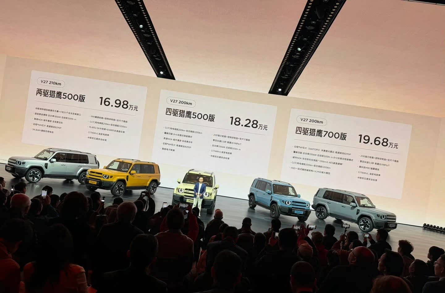 iCAR V27正式上市,大号方盒子+激光雷达可选 售价16.98-19.68万元 增程 中大型SUV 车长5055,轴距2910 34.3kWh磷酸铁锂电池 纯电续航200km/210km 综合续航1200km+ 1.5T增程动力 两驱/四驱版 四驱版零百加速5.5秒 智能电子限滑(中高配) MRC磁霸悬架(顶配) 标配猎鹰500辅助驾驶系统, 高速NOA/城市满油/全场景泊车。 顶配猎鹰700+征程6P芯片+激光雷达, 一段式端到端+VLM云端大模型, 城市NOA/车位到车位领航。 8295P芯片+征程6M芯片 8.88吋仪表+15.4吋中控屏 限时免费赠送: ①超纤绒麂皮顶棚 ②23扬爱乐之声音响 ③四驱版加送拖车套装 朋友们觉得这个价格如何? #iCARV27##V27全能硬派全家都爱##iCARV27全能上市16.98万起#