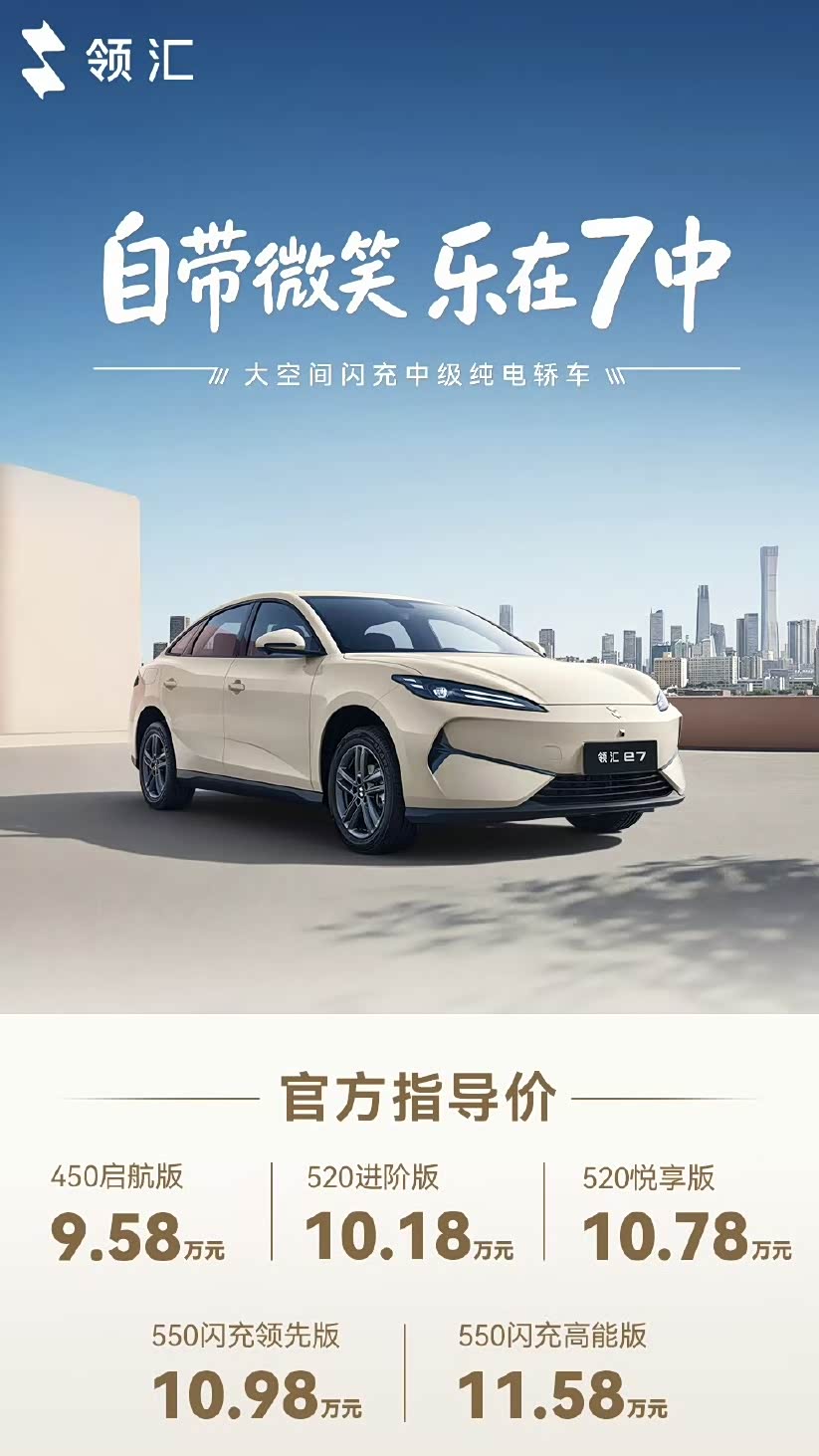 4月15日,比亚迪旗下领汇品牌首款车型——领汇e7正式上市。共推出5款配置,官方指导价 9.58-11.58万元。 新车定位大空间闪充中级纯电轿车,大空间纯电中级轿车,主打闪充体验,搭载第二代刀片电池,充电更快,低温也稳。还有宽适空间和多种续航版本,兼顾家用通勤与营运需求。不到10万,就可以将补能效率、空间体验和实用性做充分!