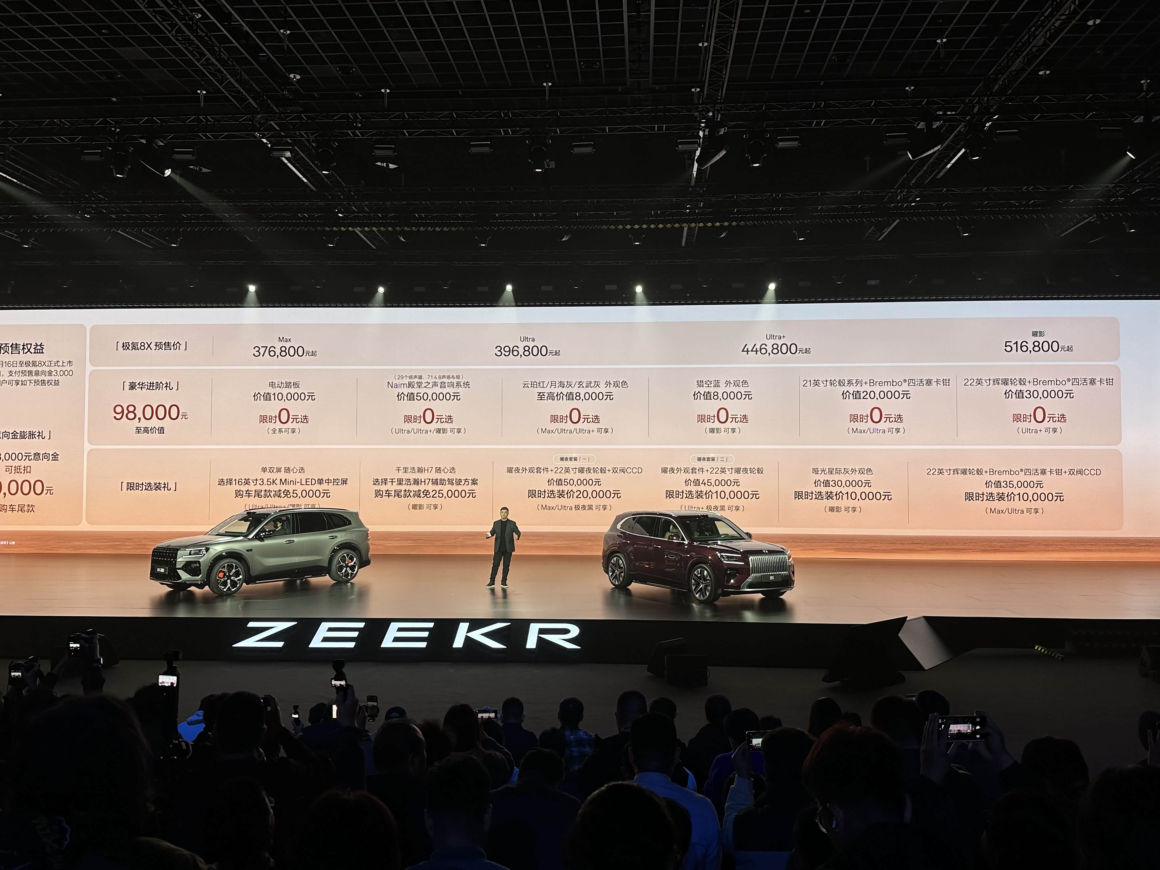 4 月 17 日宁波官宣,超级电混高性能旗舰 SUV 极氪 8X 重磅登场,直接把高性能 SUV 的价值标准重新定义了! 限时售价32.98 万起,Max/Ultra/Ultra + 三款版型任选,性能版曜影同步开售,限时 47.38 万,2.96 秒破百,妥妥的全球加速最快混动 SUV!详细售价看下面! 极氪8X Max:零售价35.68万元,限时价32.98万元 极氪8X Ultra:零售价37.68万元,限时价34.98万元 极氪8X Ultra+:零售价42.68万元,限时价39.98万元 极氪8X 曜影:零售价50.08万元,限时价47.38万元 全栈 900V 高压加持,全速域动力、全地形操控都拉满;中国首个舱驾融合超级智能体上线,超级 Eva + 千里浩瀚 G-ASD 4.0,智能体验直接跨代!还有行业首创的浩瀚安全盔甲,完成单车七重连环碰撞挑战,安全兜底超安心;大五座还能选六座,宾利同款 Naim 音响、137° 伊姆斯躺椅,性能和舒适终于不用二选一! 极氪 8X 联手 9X 打造超级电混双旗舰,彻底打破海外豪华品牌垄断,中国高性能 SUV 真的支棱起来了!