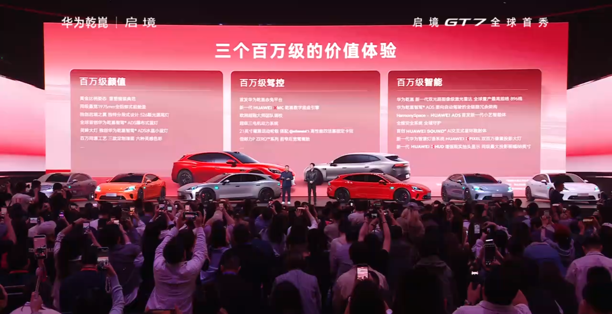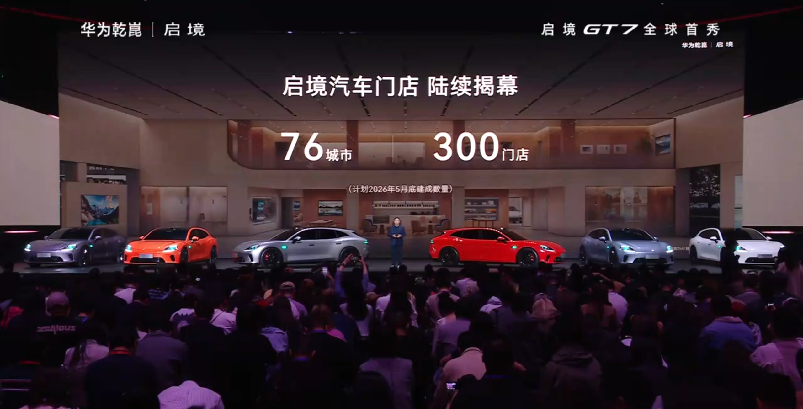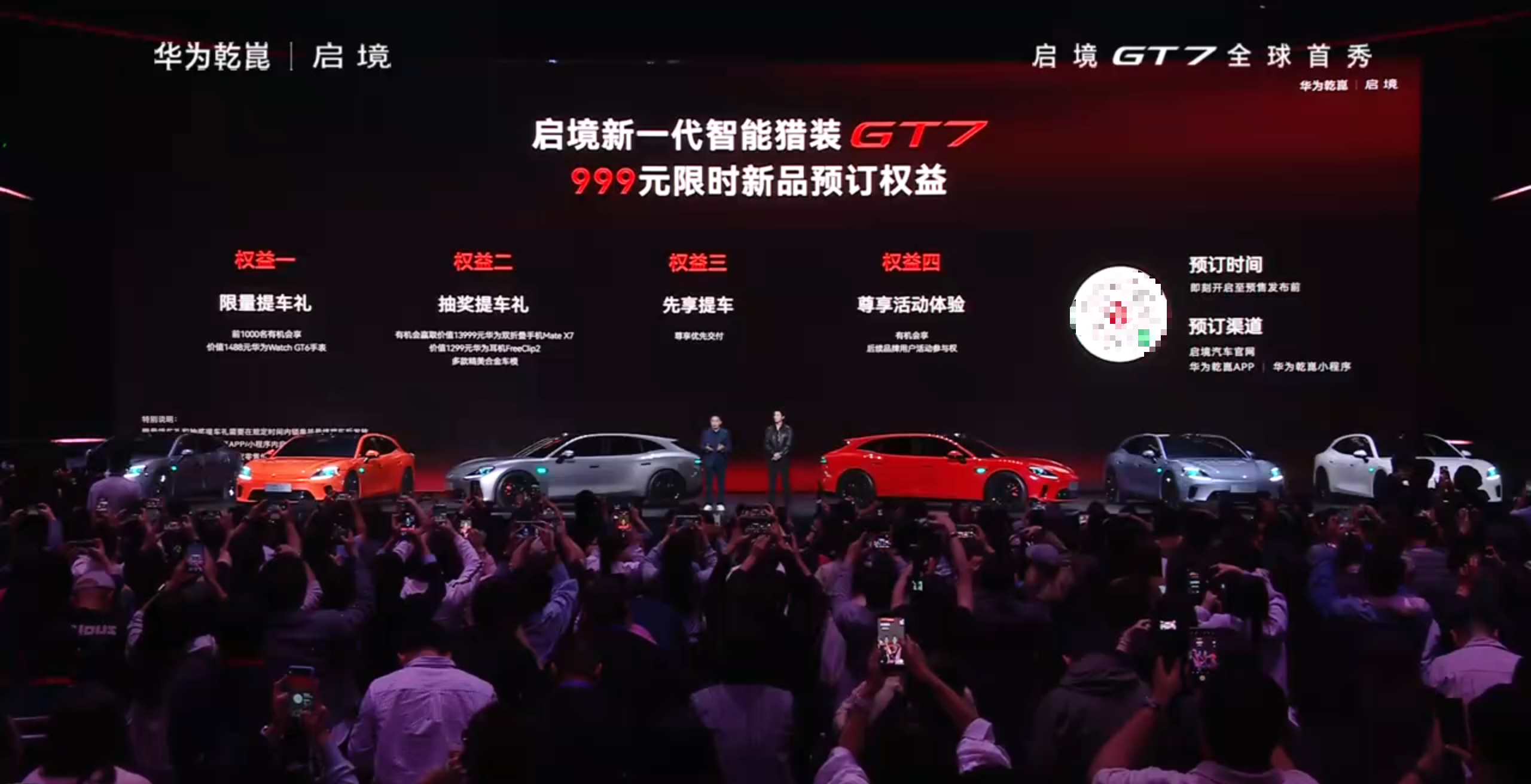 能叫GT的都有点东西!启境首款猎装车启境GT7迎来首秀,并开启999元限时新品预定权益,享4重重磅权益,4月北京车展还会跟大家见面。启境计划5月底在76座城市,建成300家门店,主要聚焦在一二线城市的商圈。 新车的颜值还是很在线的,一登场大家都在拍照,标志性的大屁股,无边框车门,这次特意提到了车身比例,现场PK超跑,作为新能源还是四门版,姿态拿捏的挺对味了。 配置方面,瀑布式小蓝灯、双百万智慧投影大灯、2.2平米全景调光天幕都会上车,首发新一代小艺智能体,华为提供智能化方案,包括896线激光雷达、鸿蒙座舱和数字底盘等,广汽则负责制造和品控。 性能层面很下功夫,14处低风阻设计,21英寸熏黑轮圈,四活塞红色卡钳,倍耐力的鸳鸯胎,后轮宽度来到了275,三电机布局,运动化的底盘调校,现场靳总透露,弯道、跑山、麋鹿测试成绩都很好,具体参数和成绩下次公布。 最后再来个新车预告,第二款车型定位中大型SUV,年内发布,评价为:空间气场拉满。特邀嘉宾黄景瑜还空降现场,官宣成为启境全球品牌代言人,给大家预定了共创版,启境,很起劲儿。