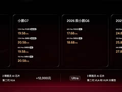 1月8日,2026小鹏全球新品发布会上,小鹏汽车正式发布2026款小鹏P7+、小鹏G7超级增程、2026款小鹏G6、2026款小鹏G9。具体来看,2026款小鹏P7+有超级增程和纯电两种能源形式,超级增程有1550 Max 科技版和1550 Max 旗舰版,官方指导售价为18.68万元和19.88万元;纯电有615 Max旗舰版和725 Max 旗舰版,官方指导售价为18.68万元和19.88万元。 纯电车型提供全系800V平台、全系5C超充AI电池、CLTC续航里程至高725公里。增程版CLTC纯电续航里程430公里,综合续航里程1550公里。2026款小鹏G9和小鹏G6也迎来了上市,小鹏G9共推出3款车型,售价区间为24.88-27.88万元;小鹏G6共推出2款车型,售价区间为17.68-18.68万元。作为改款车型,新车其主要针对车机芯片等配置进行升级。小鹏G7超级增程版共推出2款车型,售价为19.58-20.58万元。此外,官方还公布了纯电Max旗舰版的售价,共推出2款车型,售价19.58-20.58万元。车辆针对外观进行了升级调整。同时,车辆将搭载1.5T增程动力系统,纯电续航430km,综合续航可达1704km,并标配800V技术和5C超充电池。