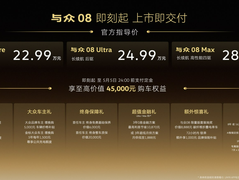 4月16日,与众08上市,新车是大众安徽汽车旗下全新纯电SUV,新车共推出3款配置车型,售价22.99-28.99万元。具体来看,新车采用了大众汽车全新的设计语言,前脸配备由400多个可独立控制LED灯珠组成的隐藏式矩阵大灯,支持交互式灯光效果自定义,车身尺寸方面,新车长宽高分别为5000/1954/1688mm,轴距3030mm,整车侧面来看呈现短前悬、长后悬的布局,尾部配备宽厚的车顶扰流板装饰,并配备隐藏式的后雨刷器。车内配备10.25英寸全液晶仪表、为双14.96英寸2.4K超高清智能双联屏,搭载高通骁龙SA8295P高性能座舱芯片,车机搭载AI智能伙伴。舒适性配置上,新车提供女王副驾、可调光全景天幕、车载冰箱等。动力上,新车基于800伏平台打造,搭载高性能800伏碳化硅电驱系统,提供单电机后驱与双电机四驱版本。单电机版最大功率230kW;双电机四驱版前电机140kW、后电机230kW,电池为宁德时代磷酸铁锂电池,提供82kWh/95kWh两种容量,82kWh电池续航为630km,95kWh电池CLTC续航最高730km/700km。