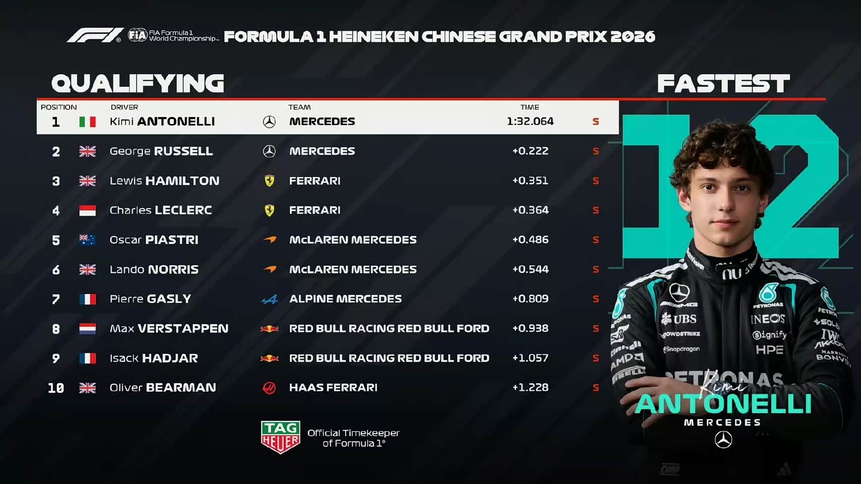 北京时间3月14日,2026赛季F1中国大奖赛排位赛在上海国际赛车场落幕,梅赛德斯19岁意大利小将安东内利以1:32.064的成绩斩获生涯首个杆位,以19岁201天打破维特尔纪录,成为F1历史最年轻杆位获得者,同时也是2009年后首位夺F1排位赛杆位的意大利车手。 本场排位赛各阶段竞争激烈,Q1勒克莱尔领跑,塞恩斯、阿隆索、佩雷兹等6人遭淘汰;Q2安东内利以1:32.443拿下头名,霍肯伯格、奥康等6人止步。Q3拉塞尔赛车突发故障,安东内利扛起争杆重任,最终梅奔包揽头排,拉塞尔1:32.286居次。 全场最终成绩前十为:安东内利、拉塞尔、汉密尔顿、勒克莱尔、皮亚斯特里、诺里斯、加斯利、维斯塔潘、哈贾尔、贝尔曼,法拉利包揽三四位,迈凯伦占据五六位,红牛表现低迷,维斯塔潘仅列第八。其余车手从第11位的霍肯伯格到第22位的佩雷兹依次排开,成绩差距逐步拉开。 此前安东内利澳大奖赛带伤获亚军,此番再创纪录印证了梅奔破格提拔的眼光。明日正赛,手握杆位的他能否将优势转化为生涯首个正赛冠军,成为最大看点。