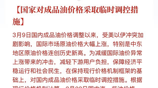 根据国家发改委消息,新一轮成品油调价窗口将于今天(3月23日)24时开启。国家发展改革委今天表示,3月9日国内成品油价格调整以来,受美以伊冲突加剧影响,国际市场原油价格大幅上涨,特别是中东地区原油价格连创历史新高。为减缓国际油价异常上涨带来的冲击,减轻下游用户负担,保障经济平稳运行和社会民生,在保持现行价格机制框架的基础上,对国内成品油价格采取临时调控措施。 具体情况如下:根据现行价格机制计算,自3月23日24时起,国内汽、柴油(标准品)最高零售价格每吨分别应上调2205元、2120元,为减轻下游用户负担,国家对成品油价格采取了临时调控措施,国内汽、柴油每吨实际上调1160元、1115元,少涨1045元、1005元,折合成升价后,此次调控后国内汽、柴油价格(标准品)每升分别上调0.87元左右、0.95元左右,相比不作调控每升少涨0.85元左右。