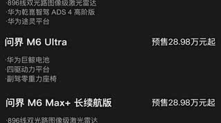 问界M6 正式开启预售,增程预售26.98万起,纯电预售28.98万起:具体来看增程Max+和增程Ultra 全系标配双电机,动力电池容量分别为37kWh/53kWh,CLTC纯电续航180km/260km/272km,综合续航超1400km,0-100km/h加速4.5秒。纯电版此前申报100度电池组,最大续航里程 760km。问界M6还会全系标配896线激光雷达共30个高精度传感器(1个新一代激光雷达、1个后向高精度固态激光雷达、5个4D毫米波雷达、2个前视摄像头、1个后视摄像头、4个环视摄像头、4个侧视摄像头与12个超声波雷达),除了具备新一代ADS辅助驾驶系统外,还能够配合闭式单腔空悬+CDC电磁减振器,提前预瞄提升行驶品质。