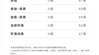 近日,随着特斯拉推出7年低息贷款购车方案,众多新势力品牌也在紧跟特斯拉的步伐。不过大家可能不会想到这个品牌也在跟进,那就是日产,日前,东风日产全车系推出8年超低息购车方案,享受96期分期,首付0元,月供低至27元,活动截止至2月28日。活动车型包括N6、N7、天籁·鸿蒙座舱、探陆、奇骏·荣誉、逍客·荣誉、轩逸、轩逸经典。 与此同时,东风日产还推出新春限时礼遇,即日起至2月28日24点,下订东风日产用户可享至高2.7万元政企双重补贴,至高2.6888万元装备及服务升级礼包。
