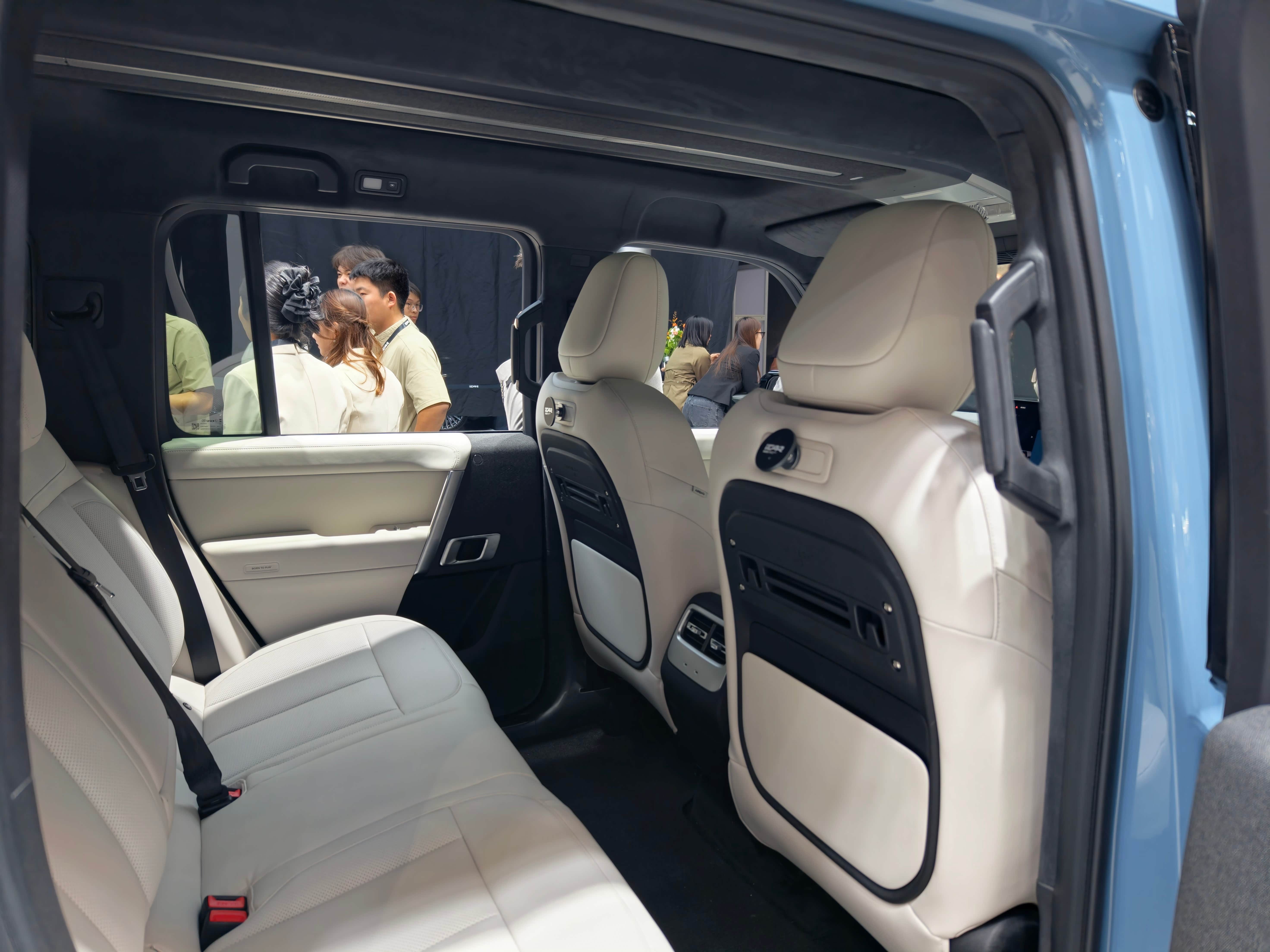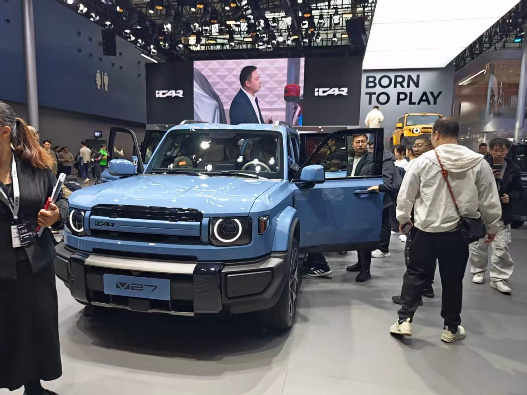 iCAR V27广州车展首秀 现场看真的大,本来尺寸就大(备胎版车长5055mm,储物版4909mm) 再加上方盒子车型天然的车高优势,确实实车很有气场 离地间隙220mm,涉水深度600mm,可以搞个轻越野了 智能层面 高通骁龙8295P芯片 + 15.4英寸中控屏 地平线HSD系统(征程6P芯片)+猎鹰700辅助驾驶