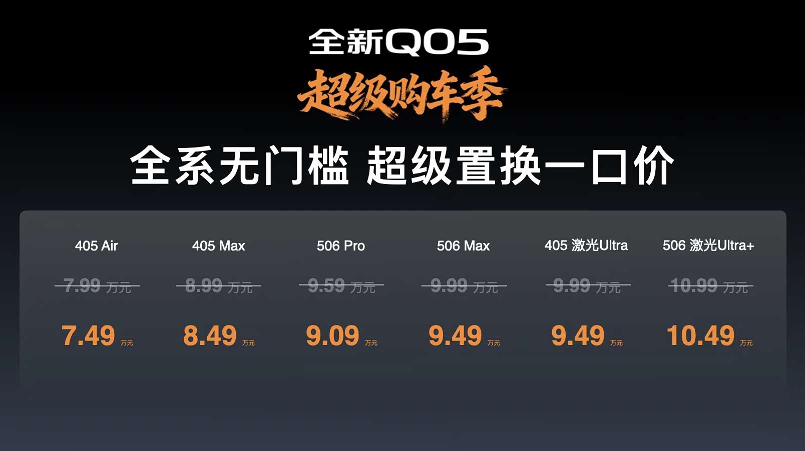 刚才全新Q05搞了购车季小发布会 简单:又降了5000,7.49起,新政策+新权益 1、三电终身质保,整车 6 年或 15 万公里质保;电池衰减只换不修;电池自燃 1:1 赔付 2、跨年交付购置税补贴兜底, 12 月 31 号前都可以 3、全系无门槛超级置换,直减 5000 元等于丐版现在只要7.49万 之前所有订的客户都新权益算 这个行业真的太卷了[笑哭]