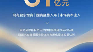 深蓝汽车宣布完成C轮融资,这次增资由长安汽车、重庆渝富控股集团有限公司、招银金融资产投资有限公司共同出资,总计募集资金61.22亿元。#汽车资讯# #深蓝汽车#