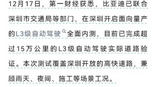 第一财经的消息,比亚迪已联合深圳市交通局等部门,在深圳开启面向量产的L3级自动驾驶全面内测,目前已完成超过15万公里的L3级自动驾驶实际道路验证。本次测试覆盖深圳开放的高快速路,兼顾雨天、夜间、施工等场景工况。 感觉这两天跟L3智驾有关的新闻挺扎堆啊,大规模的实用化应该离我们不远了吧[馋嘴] #新能源汽车# #汽车资讯#