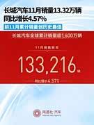 长城汽车11月销量13.32万辆,同比增长4.57%,前11月累计销量创历史最佳 #长城汽车 #长城汽车销量