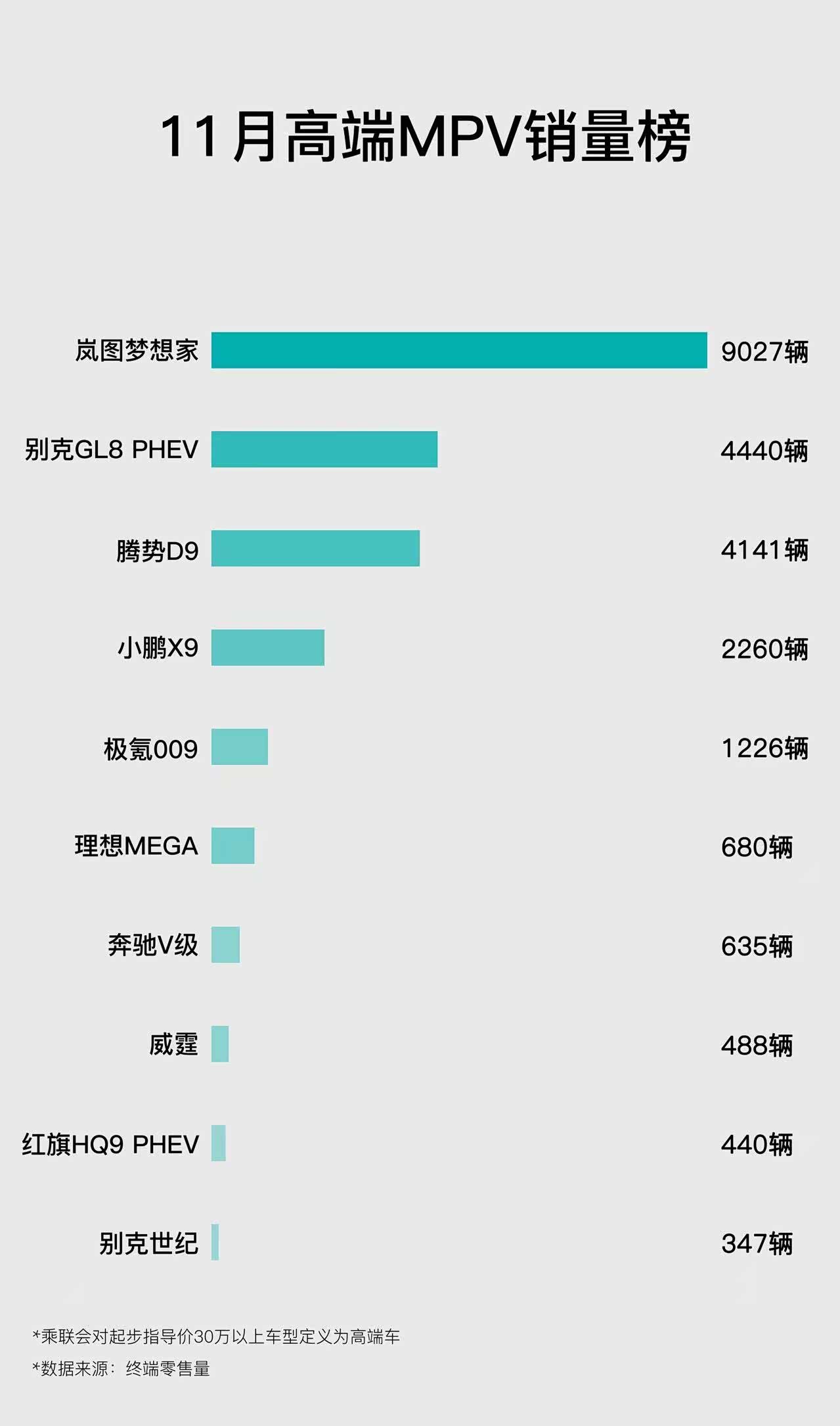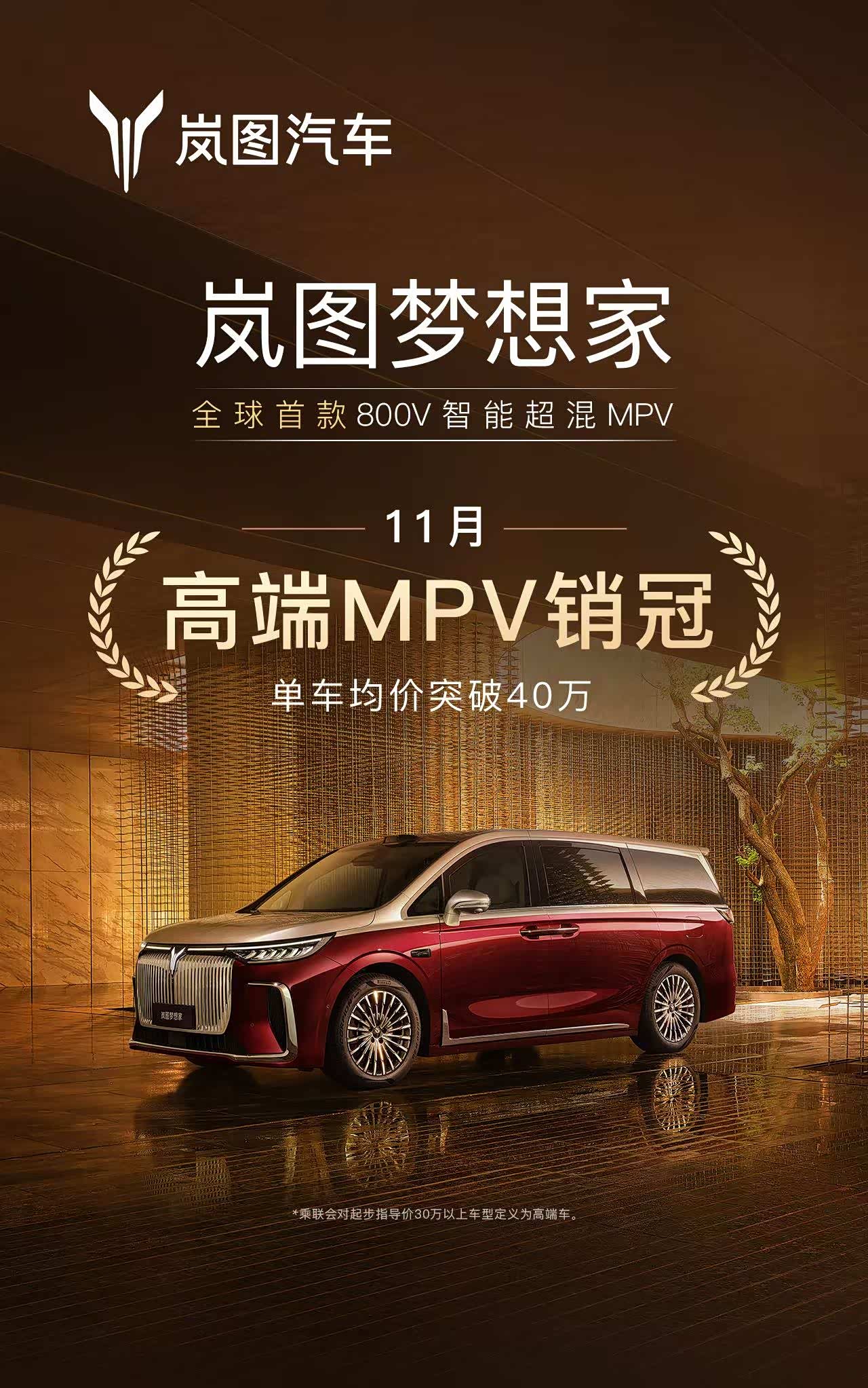 岚图梦想家11月封顶高端MPV销量排行榜。 这车均价突破40万! 55%用户来自BBA等传统豪华品牌增换购。 高端SUV泰山大定数据很炸裂。 高端轿车追光L即将上市。 三个高端品类布局,MPV非常成功,SUV昭示成功,看看追光L能不能在轿车领域也成功。