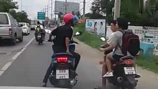 两摩托车路边吵架,路怒男子一脚踢向情侣,车祸瞬间被拍下!