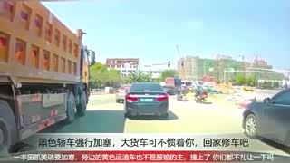 行车记录仪黑色轿车强行加塞,大货车可不惯着你,回家修车吧