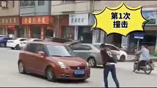 一男子不断用头撞小车,现场清晰听到碰撞声,场面十分混乱