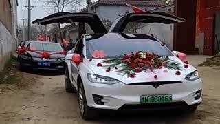 村里的首富结婚,婚车是特斯拉,车门让人大开眼界!
