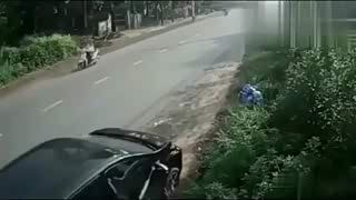 乡间小路轿车随意开车门,摩托男子瞬间被弹飞