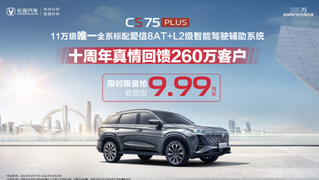5月24日,长安汽车针对第三代 CS75PLUS 宣布推出限时优惠,截止至5月31日,第三代 CS75PLUS 冠军版车型最高优惠 2.2 万,优惠后入门车型仅 9.99 万元。 车侧和车尾部分,车配备了造型别致的贯穿式尾灯组,具有较高的辨识度,后包围采用了双色设计,赋予车辆更强的时尚属性。 外观方面,长安 CS75 PLUS 冠军版继续延续御岳动感格栅设计同时,还汲取了 " 战斗机元素 " 设计风格,同时还带有独特的 " 战斗机式 " 雾灯盖板设计,搭配横向纵向延伸的红色装饰亮条侧面线条硬朗。 动力方面,第三代 CS75 PLUS 冠军版全系标配爱信 8AT 手自一体变速箱,全系标配 L2 级智能驾驶辅助系统,同级唯一搭载并线辅助、蓝牙钥匙。
