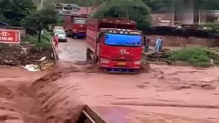 一群胆子大的大货车,洪水都冲上桥面了,还一辆接一辆的冲