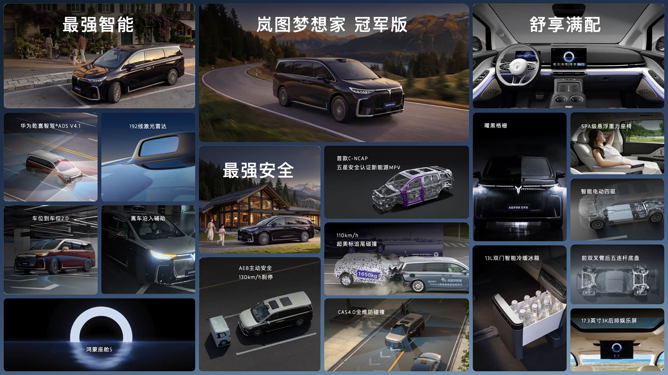 岚图梦想家冠军版今天上市,售价30.99万元。时间点也比较有意思,同一天,第20万辆梦想家在武汉工厂下线。 从产品配置看,这次冠军版最大的变化其实集中在智能化部分。 新车直接上了华为乾崑智驾ADS 4和鸿蒙座舱5,在30万级MPV里,这一套组合目前确实不多见。 激光雷达方案、窄路掉头辅助这些能力,本质上是在解决MPV这种大车在城市里的使用焦虑,掉头、窄路会车、停车场这些场景,往往比高速更考验系统能力。 安全也是这次重点强调的部分。官方给出的信息里有两个比较值得注意的数据,一是110km/h的高速追尾测试,二是130km/h触发的AEB自动紧急制动能力。 另一个细节是第三排座椅靠背增加了高强度钢板,这个设计逻辑其实很明确,MPV家庭使用场景里,老人和孩子往往坐第三排,结构强化比单纯配置更重要。 舒适层面依然是MPV传统优势。前双叉臂+后五连杆悬架、255mm宽胎、后排17.3英寸娱乐屏、冷暖箱等配置,本质上都是围绕长途出行体验做的补充。 另外一个背景是岚图汽车即将在3月19日登陆港交所,20万辆下线节点、梦想家冠军版上市、资本市场动作,岚图用这几个节点开启今年的发展势头。
