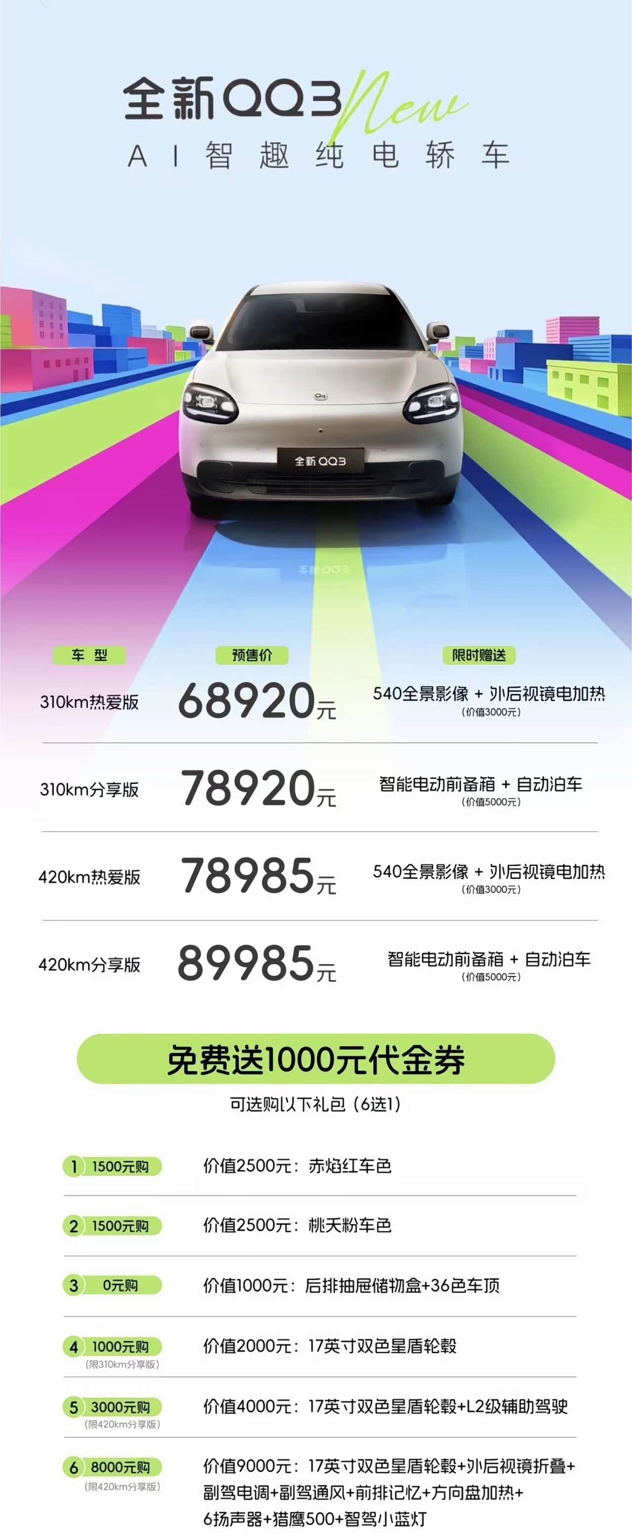 奇瑞把QQ这个名字重新拿出来,本身就是一件挺有象征意味的事,很多人第一次接触汽车品牌,其实就是从当年的QQ开始。 那是一台价格不高、结构简单的小车,但在很长一段时间里,它几乎等同于中国人最早的一批私人汽车记忆。 这次奇瑞QQ3预售价 68,920 元起,尺寸依然是A0级,但轴距做到2700mm,这个数字在同级里已经比较激进,车内空间的思路也很明显,更多储物、前备箱、后备箱电动化,都是把有限的车身尺寸尽量利用起来。  另一个比较有意思的方向,是把小车的技术配置往上推,比如高通8155芯片、15.6英寸中控屏、生成式交互界面以及AI助手,这些配置过去通常出现在更高价位车型里。 机械结构上也能看出取向,后置后驱、四轮独立悬架、5.2米转弯半径,这些组合更偏向灵活和操控感,而不是单纯追求成本压缩,对于一台体型很小的车来说,城市道路的掉头、转弯、停车效率反而是核心体验。  续航和充电则维持在一个比较务实的区间。310公里和420公里两种版本,30到80补能大约十几分钟,基本是当前小型纯电车比较典型的技术水平。