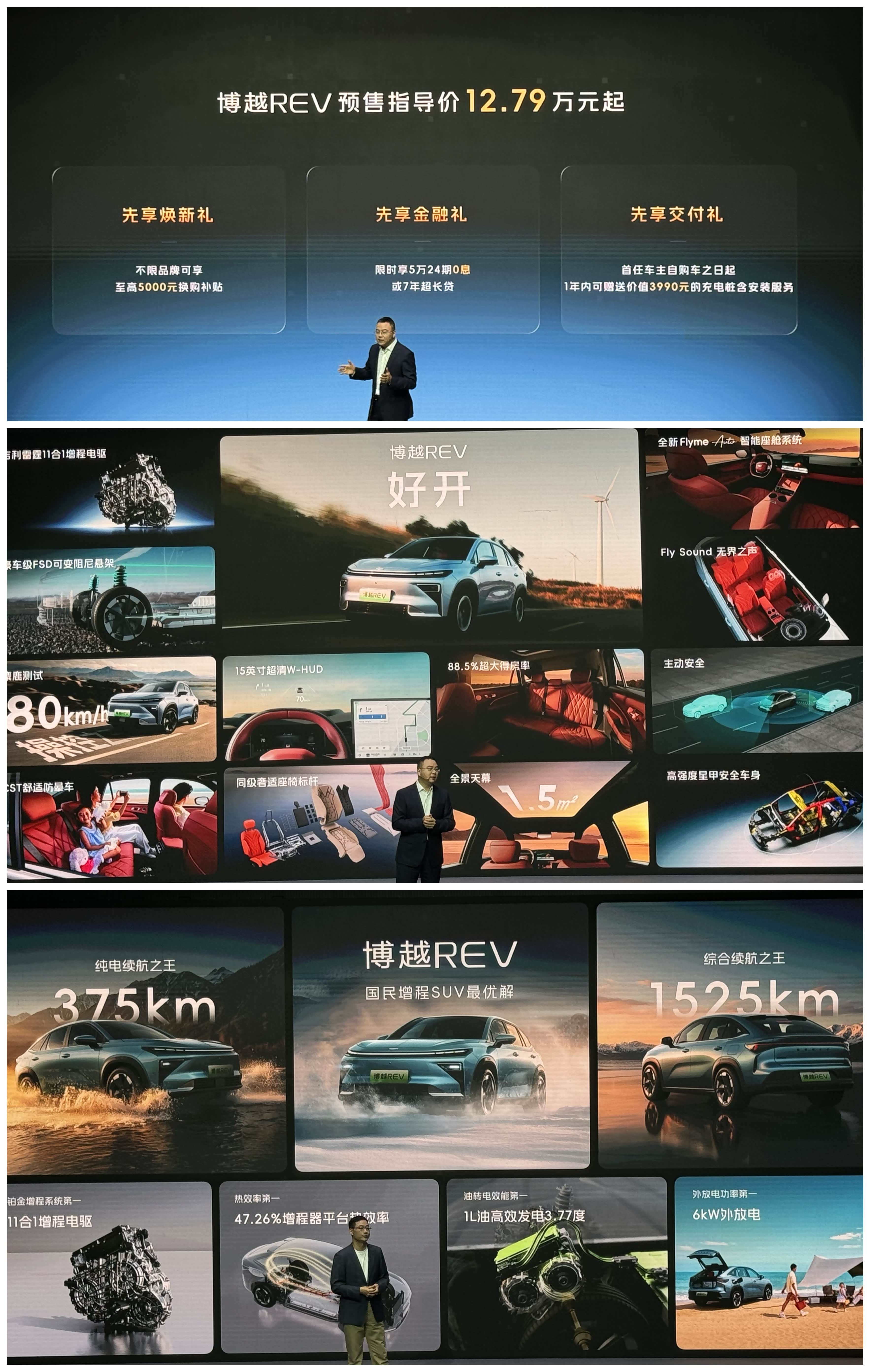 博越REV这台车的核心不复杂, 375km纯电续航,基本覆盖一到两周通勤,1525km综合续航,把长途补能频率压到很低。 对于大多数家庭来说,用车节奏会明显改变,充电优先,油更多变成兜底。 动力系统强调效率和一致性。高集成增程电驱,配合接近47%的热效率,1L油发电接近3.8度,馈电油耗控制在5L以内。 更关键的是满电和馈电状态下的动力差异被压缩,高速巡航和加速不会明显衰减。 补能节奏也在提速,50.4度神盾金砖电池,支持3C快充,30到80大约15分钟,外加6kW外放电,既解决日常,也覆盖露营这类场景。 底盘和操控偏舒适取向,FSD可变阻尼悬架配合防晕车优化,小转弯半径加全景影像,城市使用门槛不高。 座舱部分是典型家用导向,大空间、纯平地板、可放倒大床,加上多屏交互和车机生态,重点在长时间使用的舒适性,而不是炫技。 设计层面走的是稳态审美,溜背比例、贯穿灯组、全景天幕,放在当下不激进,但耐看。 12万级起点叠加这套配置,本质是在压缩增程SUV的价格带,把原本接近20万级的体验往下拉。 产品没有特别冒险的地方,但每个关键点都尽量做到位,期待正式上市的价格。