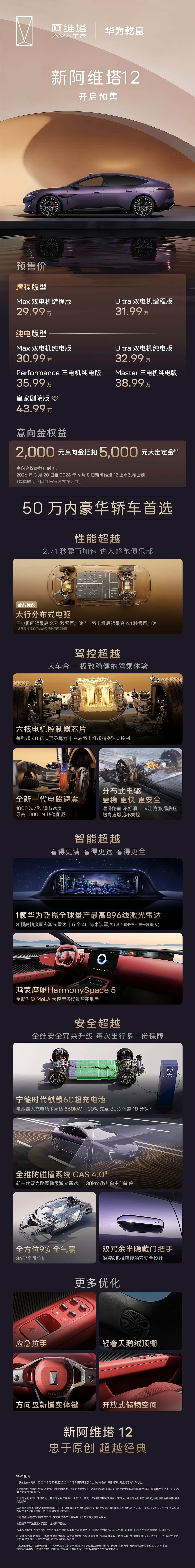 增程版: Max双电机增程版29.99万元, Ultra双电机增程版31.99万元; 纯电版型, Max双电机纯电版30.99万元, Ultra双电机纯电版32.99万元, 高性能三电机纯电版35.99万元, Master三电机纯电版38.99万元, 皇家剧院版43.99万元。 性能方面,新车全系标配太行分布式电驱,三电机四驱版最高2.71秒零百加速,双电机后驱版最高4.1秒零百加速。 驾控层面,搭载六核电机控制器芯片,每秒超40亿次算力,可对左右双电机超精密独立控制; 智能配置上,搭载1颗华为896线激光雷达,座舱升级鸿蒙座舱 5,配备全MOLA大模型多场景智能助手。 安全方面,搭载宁德时代麒麟6C超充电池,最大充电功率高达560kW,30%充至80%仅需10分钟; 配备全维防撞系统CAS 4.0,搭载新一代双光路图像级激光雷达,支持130km/h前向主动刹停; 同时配备全方位9安全气囊、双冗余半隐藏门把手,采用触摸&机械解锁双安全设计。 此外,新车优化了多项细节配置,新增应急拉手、轻奢天鹅绒顶棚、方向盘实体键、开放式储物空间等。