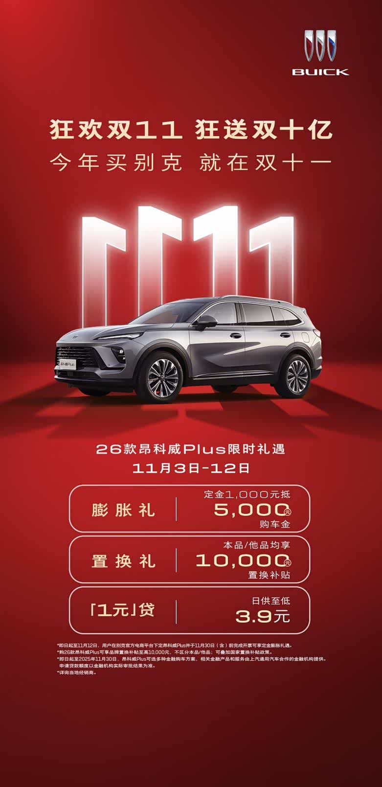 今天,别克正式启动“狂欢双11,狂送双十亿”限时大促活动。即日起至11月12日,昂科威Plus、昂科威S、君越、君威、别克E5等主力车型福利加码,结合多项购车礼遇,为消费者提供“无套路、真让利”的年内购车最佳机会。 —— 今年买别克,就选双十一! 购买昂科威Plus、昂科威S、25款君越、君威、威朗Pro、微蓝6,可享定金1000元抵5000元;购买26款君越赠送交强险;购买昂科威Plus和君越,可在“一口价”基础上,享受本品/他品置换10000元品牌补贴,并叠加享受至高15000元国补;购买别克纯电E5先享版,可在14.99万元一口价基础上,叠加至高 “15 倍超级膨胀金” 限时福利——1000 元定金抵扣15000元,实际入手价低至13.59万元;还可享受奥特能三电系统终身质保、零自燃承诺 1:1 赔付、5 年免费车控车联服务等安心保障,并可叠加至高20000元国家以旧换新补贴。 此次双十一大促进一步降低购车门槛,不搞噱头,活动仅限11月3日-12日,消费者可通过别克官方渠道了解详情,锁定年度抄底机遇。