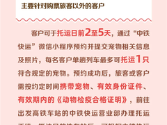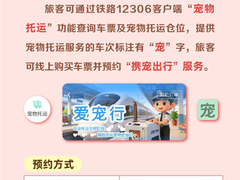铁路部门推出高铁宠物托运“爱宠行”服务,设携宠出行、爱宠单独行两种模式,办理站点扩至121座高铁站、服务列车达228趟。服务适用家庭驯养、健康、单只体重不超15千克、肩高不超40厘米、身长不超52厘米的猫犬。携宠出行可通过12306预约同车托运,每名旅客最多同车托运2只;爱宠单独行通过中铁快运小程序预约,单趟最多托运1只,均需按规定办理检疫与托运手续。服务实行隔离运输、人宠分开,宠物运输箱全面升级,具备空气循环、温湿度监测、智能加水、夜视监控等功能,全程存放于快运柜,工作人员闭环监护、运输后及时消毒。收费按里程梯次计价,携宠出行有浮动优惠,单独行按标准价,均赠2000元基础保险,此前试行已安全托运宠物超1.5万只。