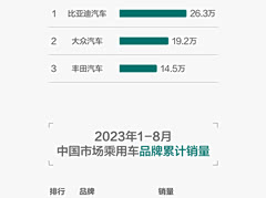 还有几天2023年就要进入第四季度了,看看8月单月及今年累计品牌销量,比亚迪对合资品牌可以说是全面碾压,单月超出大众品牌7万辆,累计则超出近40万辆。真正达成“遥遥领先”,名副其实的国内一哥啊。回想一下,比亚迪去年 11 月才成功超越丰田大众成为国内单一品牌第一。今年第一季度,又成功超越了南北大众的总计销量成为名副其实的第一,如今比亚迪的领先优势已经是越来越大了,剑指海外市场也就是顺理成章的事了。 再来看看比亚迪的海外战绩吧。 巴西:连续两个月新能源汽车销量冠军,位居销量榜前三的分别为比亚迪海豚、比亚迪D1,以及比亚迪元PLUS。 泰国:比亚迪BYD ATTO 3(元PLUS)连续8个月蝉联泰国纯电动汽车销量冠军; 在新西兰和新加坡:比亚迪的销量跟特斯拉可以说是你来我往,难分高下。 根据调查公司MarkLines的数据,比亚迪2023年上半年全球新车销量同比增长96%至125万辆,销量超过德国梅赛德斯奔驰和德国宝马,进入全球汽车品牌销量前十。