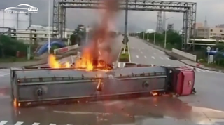 油罐车被撞翻了,好可怕