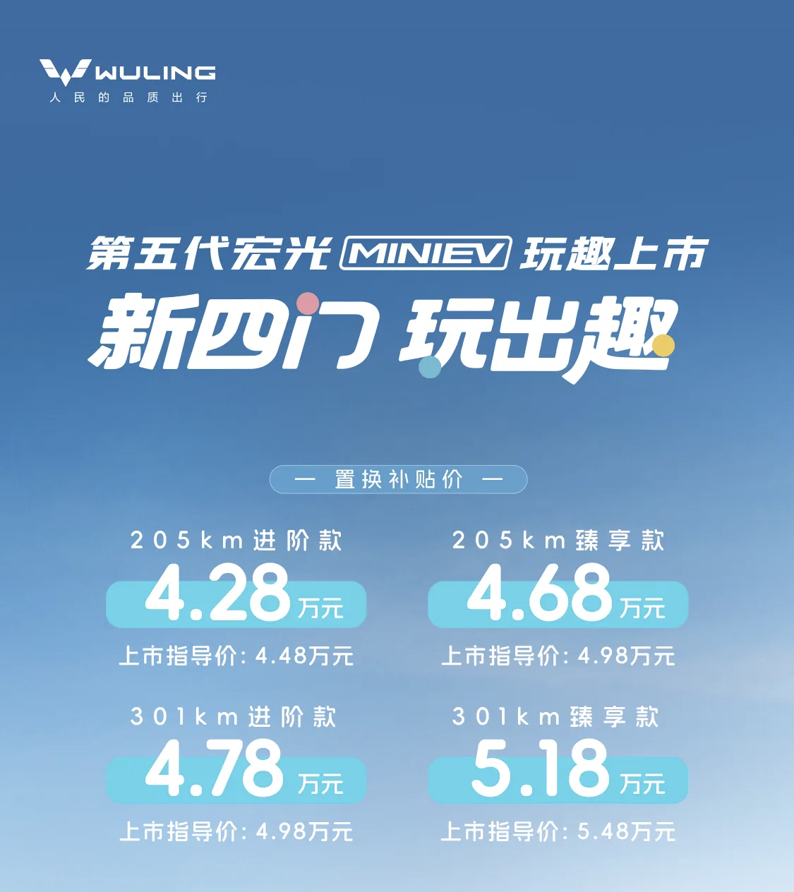 城市代步出行看一眼它。 第五代宏光MINIEV上市了,4.48万起! 置换补贴价4.28万元起。 四门四座,还是挺实用。带三两个闺蜜出门不怕争论到底谁是嫡长闺啦! 转弯半径仅4.5米,城市穿行灵活好停。 这找小车能提供205km、301km两版本,百公里电耗低至8.9kW・h,还支持直流快充等三种充电方式,一周一充城市通勤够用。 小车也科技范儿! 车内配备怀挡与多功能方向盘,10.1英寸中控屏搭载全新萌趣UI,支持多种场景功能,OTA后更可实现三大手机互联功能。
