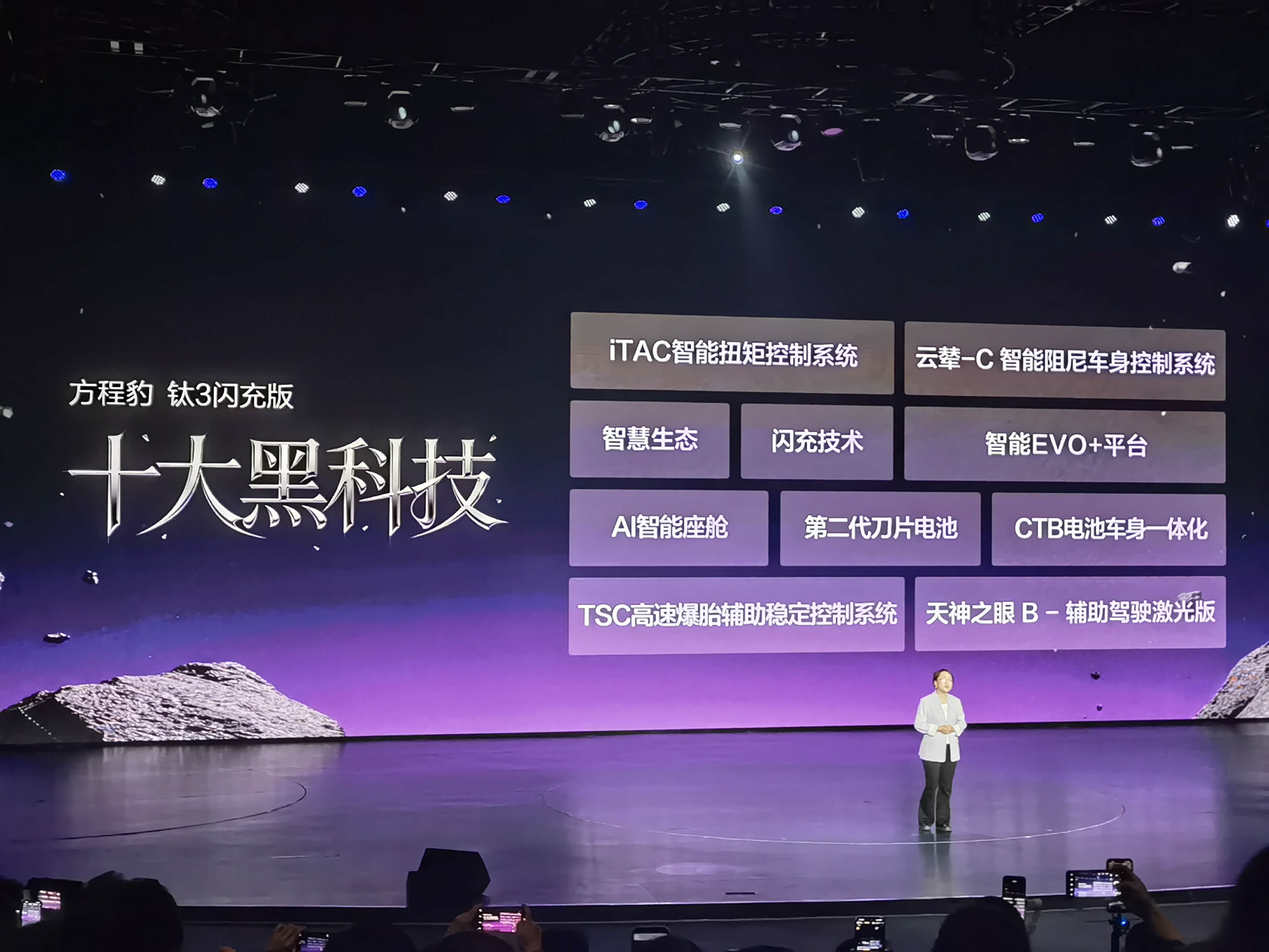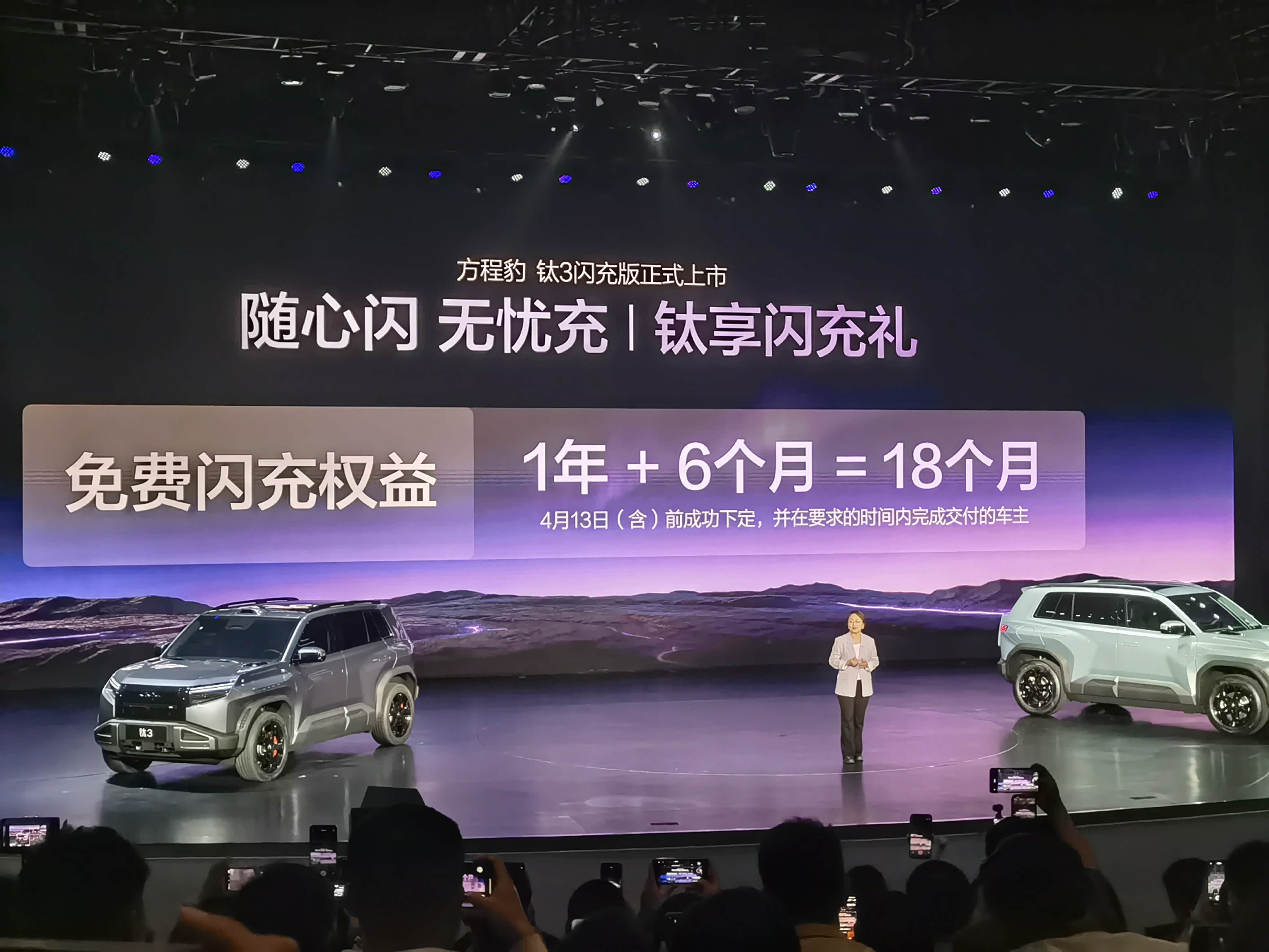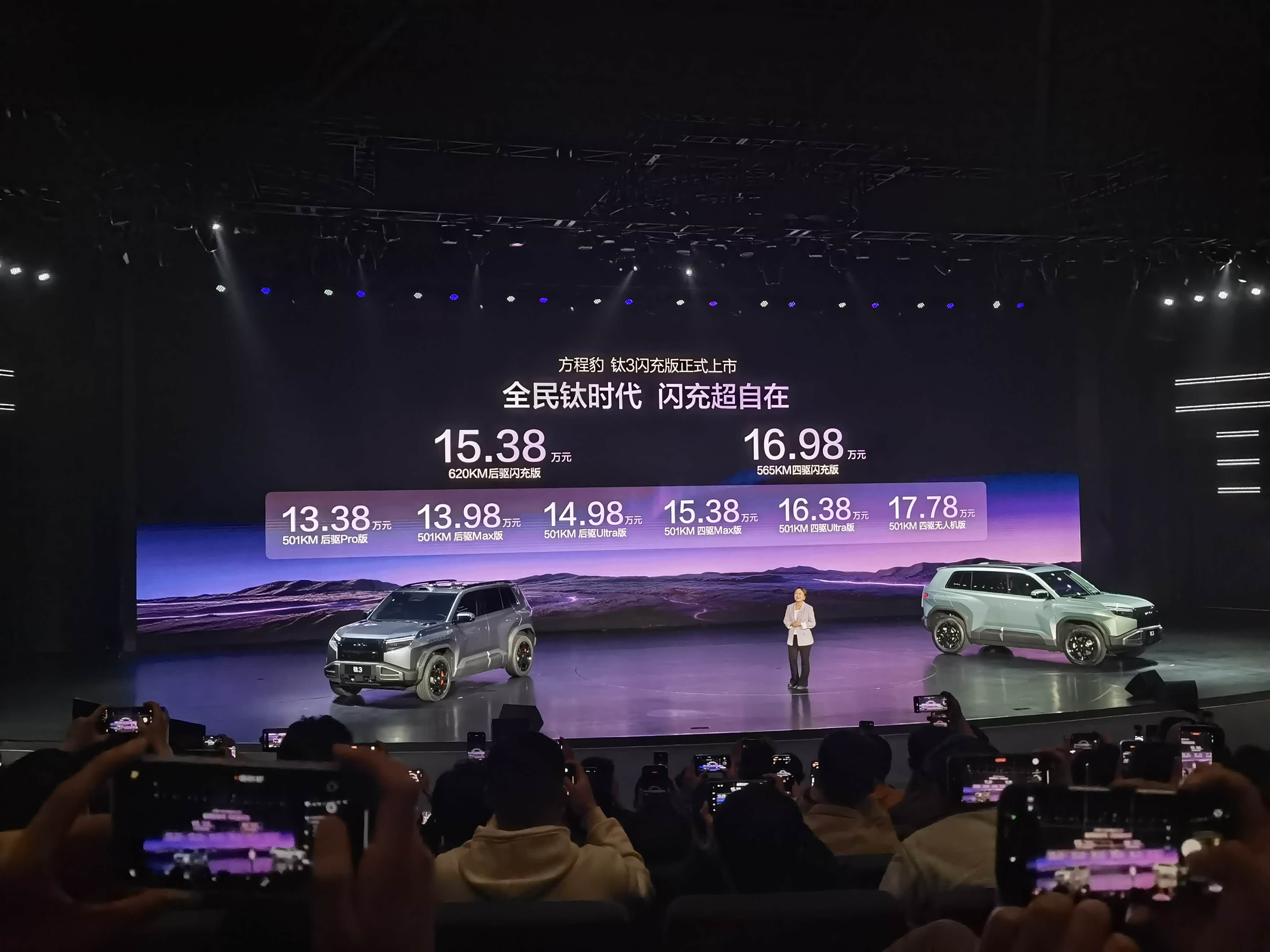 方程豹钛3闪充版上市,价格公布! 亮点有: 一是二代刀片电池+ 闪充+长续航;后驱版续航里程( CLTC )达620KM;四驱版续航里程( CLTC )达565KM。最远最高的地方比亚迪闪充站通通都要布点了,可不只是身边的4S店和高速公路网点。真是你想到哪,它就闪到哪! 二是,钛3闪充版带来了全新内饰色蓝灰双拼:冷静冰川灰+深邃极地蓝。 三是个性范,官方打造了16款车尾小书包轻潮改方案。年轻个性一族有没有心动?