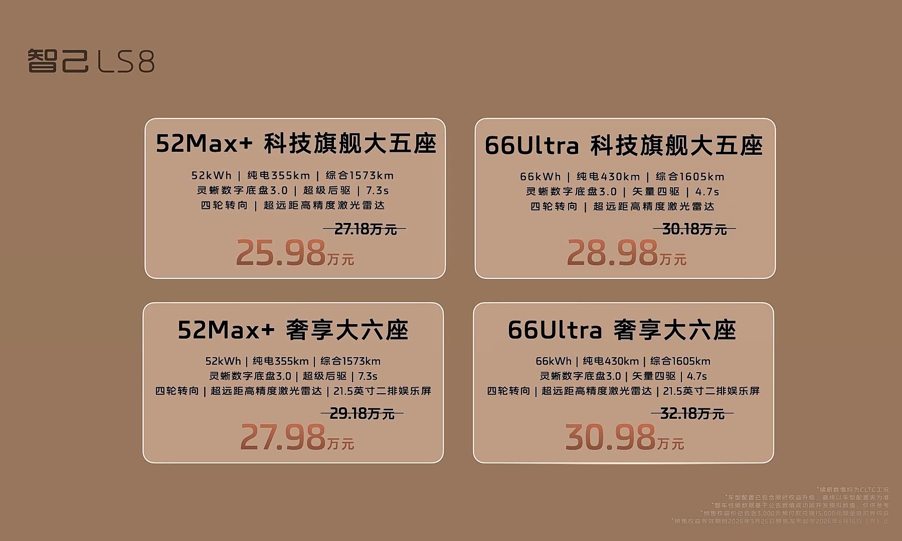 智己LS8刚刚开始预售啦! 25.98万起,这个配置和价格怎么样? 新车也是主打大五座SUV,不过,有需求的消费者还可以花个2万元,把它升级成大六座的,配置舒适度也提升了。 最大综合续航突破了1600公里,冰箱彩电大沙发全都有,也配上了全线控转向系统。 应该是集上汽之力的又一款重磅新车型了。 下月16日正式上市交付。