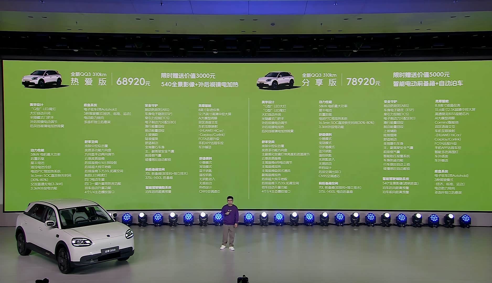全新QQ3今晚正式预售啦!共推出4个版本,6大车色。主打款款高配置高安全。一些配置还是15万级20万级才有的!新车还配上了后驱独立悬架。 68920元起的预售价,这个价格怎么样? 正式上市价格惊喜还是值得期待的。