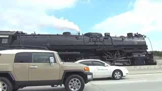 高速公路中间急速行驶的蒸汽火车