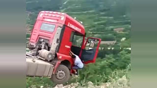 惊险:大货车疲劳驾驶冲出悬崖,还好卡住了,差点造成惨剧!