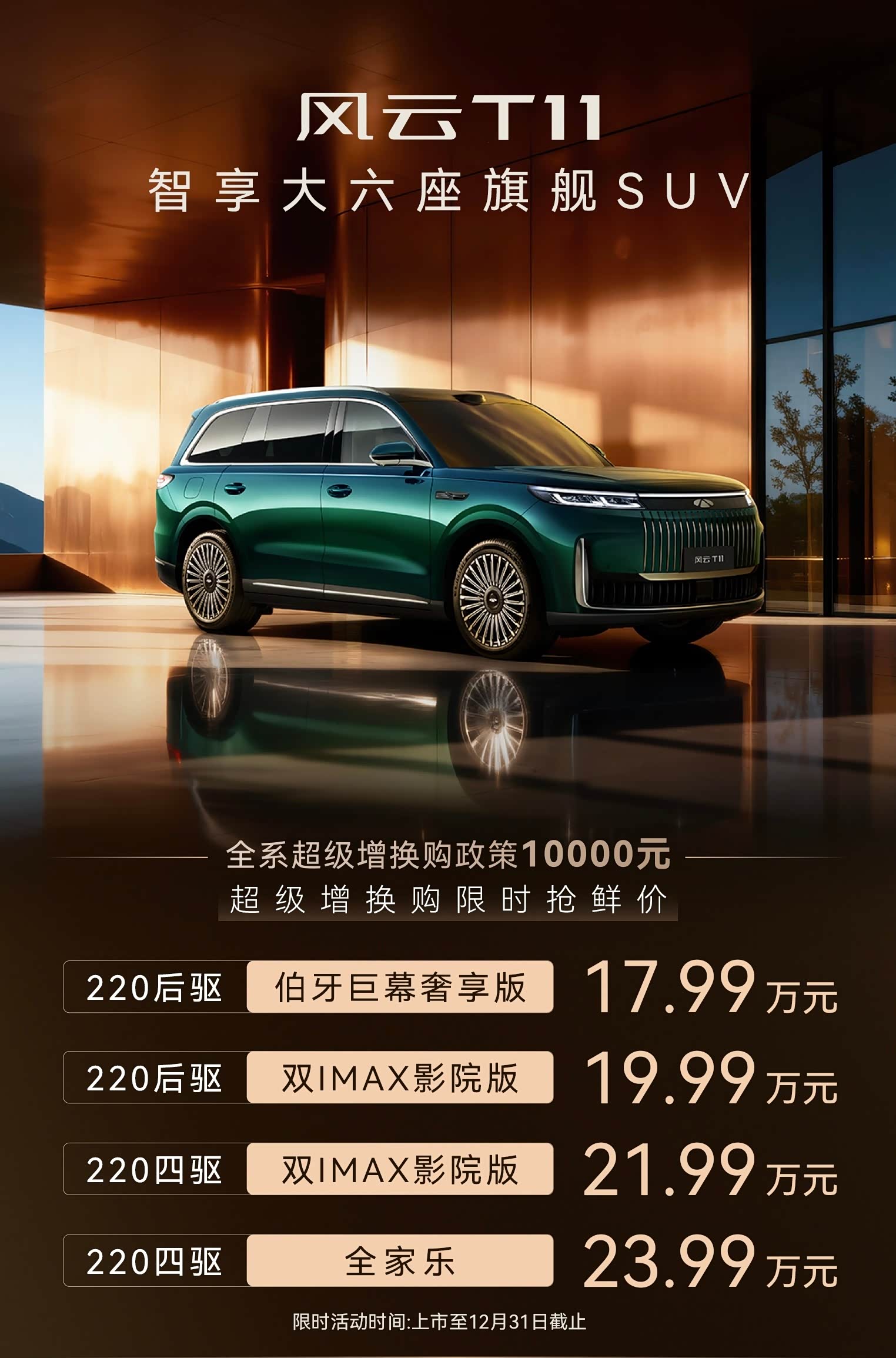 超级增换购限时抢鲜价17.99万元—23.99万元,风云T11于10月30日正式上市!此次上市推出220后驱伯牙巨幕奢享版、220后驱双IMAX影院版、220四驱双IMAX影院版、220四驱全家乐4款版型,并带来7大限时购车权益和7重服务权益。风云品牌始终坚持“以用户为中心”的理念,让用户享受到“入门即豪华”的用车体验。风云T11将11大百万级豪华配置列为全系标配,彻底打破“高端配置需加价选装”的行业惯例。